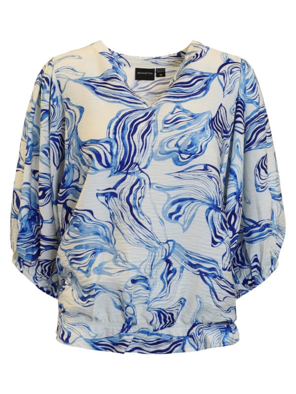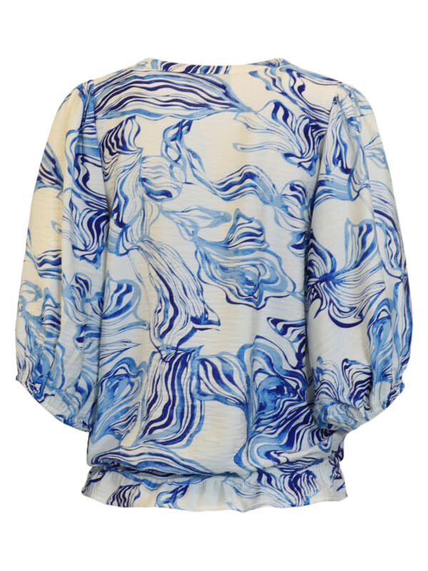 Deze leuke blouse met driekwart pofmouwen heeft een vrolijke all-over print. Het model is voorzien van een V-halsje. De elastische boord zorgt voor een rucheseffect en een mooie pasvorm.