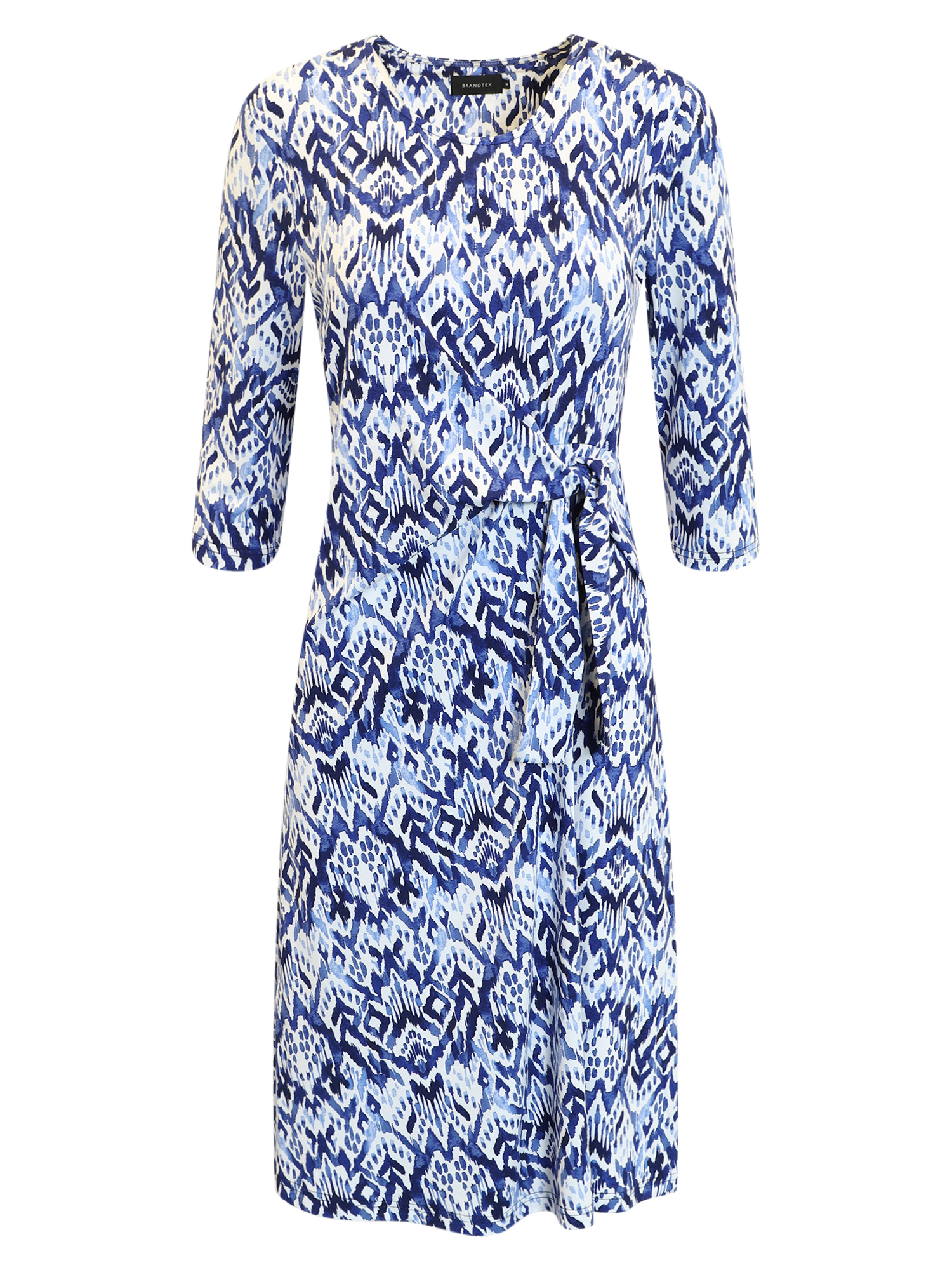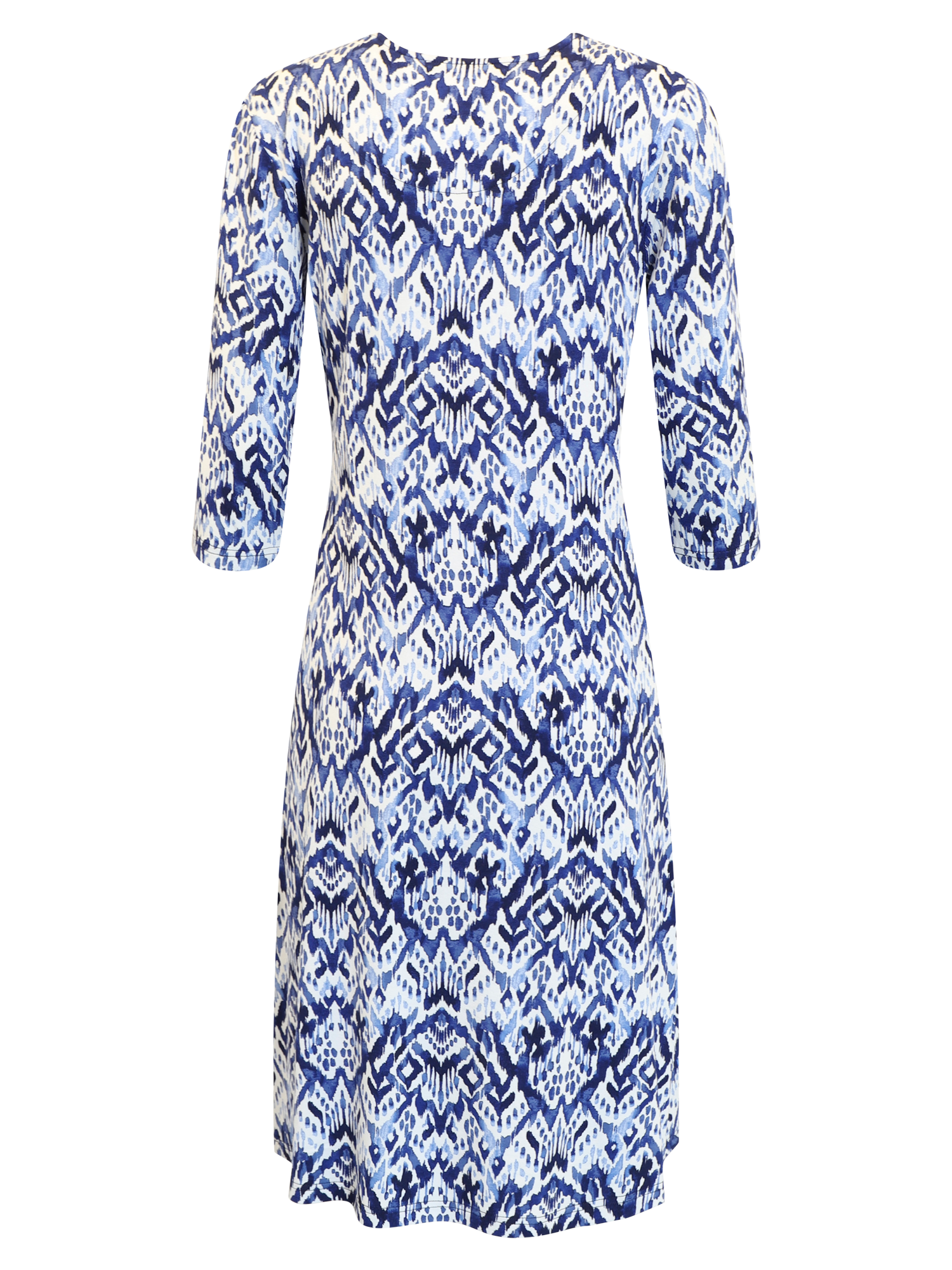 Deze jurk met een mooie alloverprint heeft een driekwart mouw en een ronde hals. De rok loopt iets wijd uit.