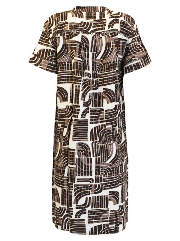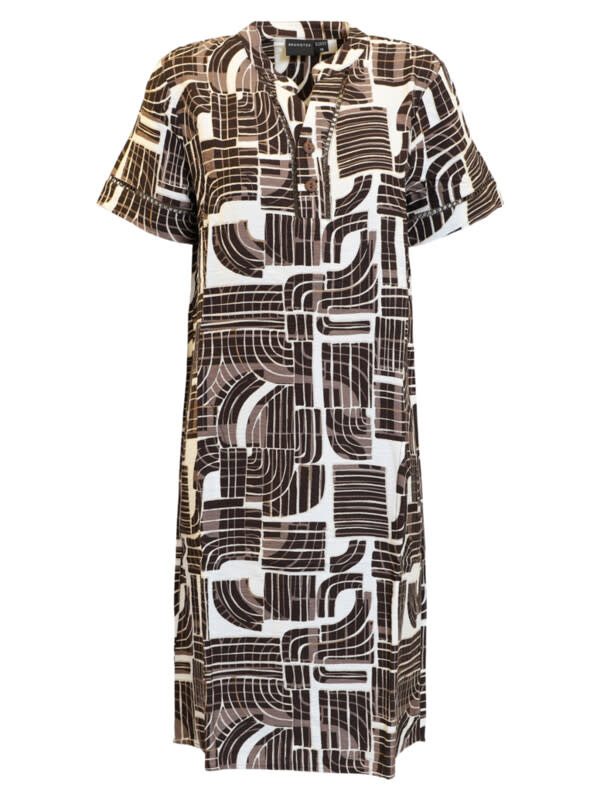 Deze jurk met een leuke alloverprint in mooie bruine kleuren heeft een rechtvallend model. De jurk heeft een V-hals met een knoopsluiting, hierlangs zit een leuke kanten randje. De jurk heeft steekzakjes en splitjes in beide zijnaden.