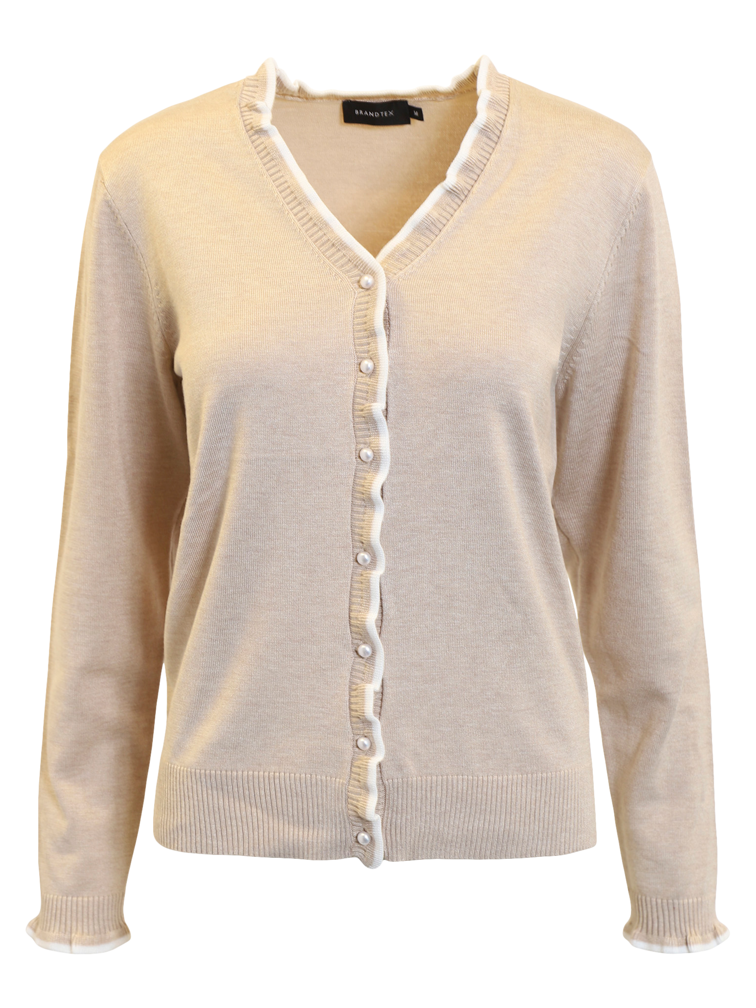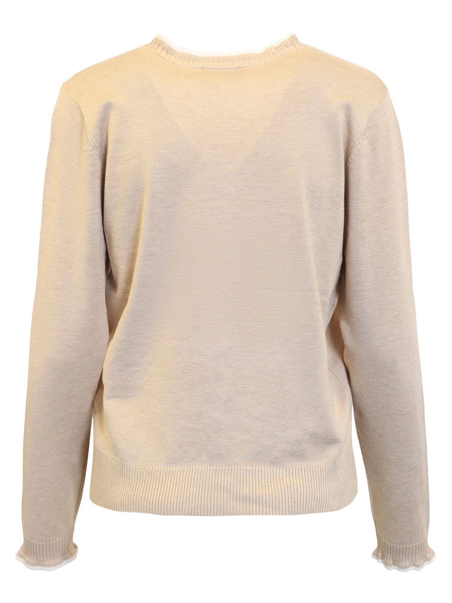 Dit leuke zandkleurige vest heeft een lange mouw en een V-hals. Middenvoor zit een knoopsluiting van parel knoopjes. Langs de hals en de knoopsluiting zit een leuk ruches randje in het wit.