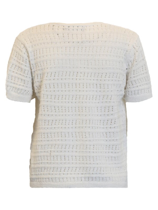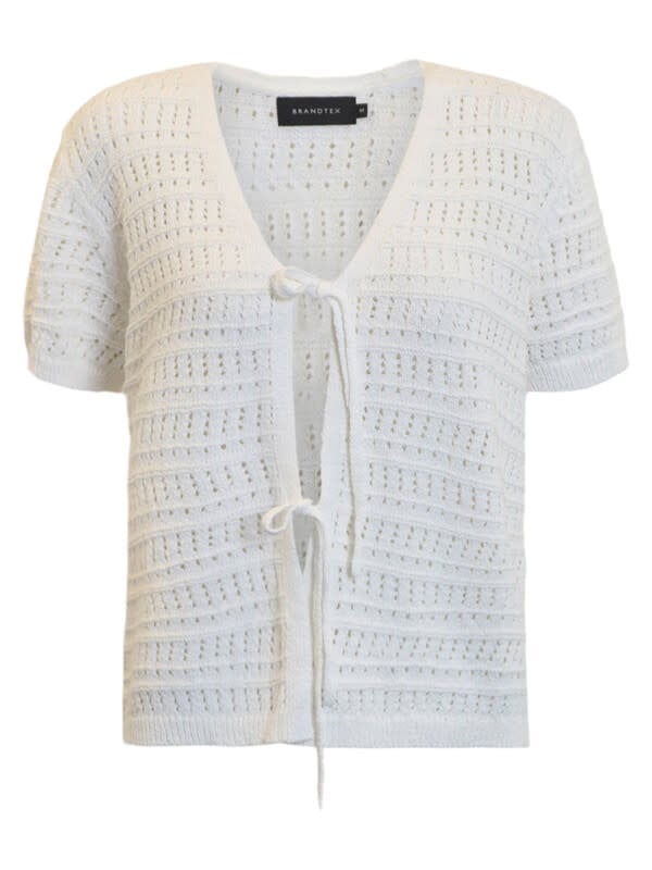 Dit vestje heeft een fijn opengewerkt breisel en heeft een V-hals. De sluiting met strikjes geeft het geheel een leuke uitstraling. Dankzij de korte mouwen is het vestje ideaal voor een zomerse dag.