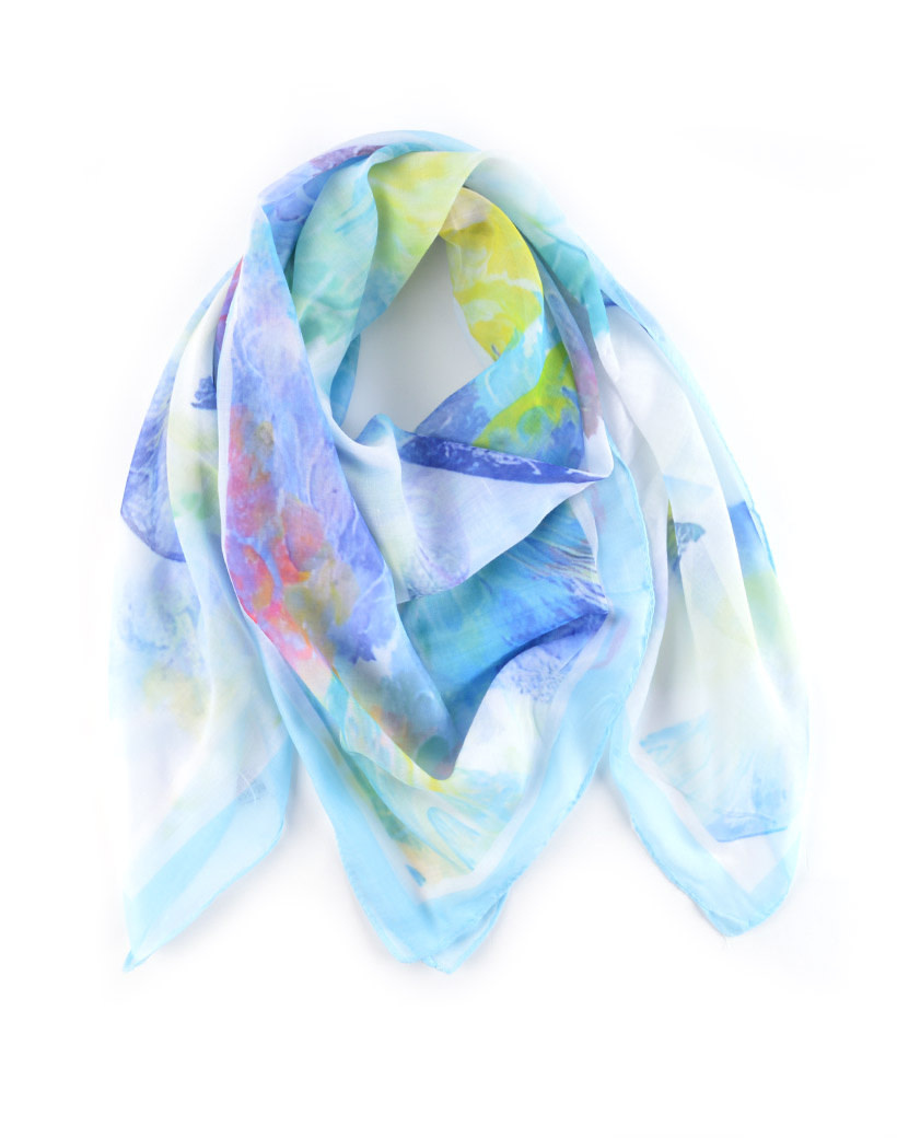 Deze sjaal is er in verschillende kleuren: blue, rose- groen, Marine- Petrol en Rose- Aqua.
