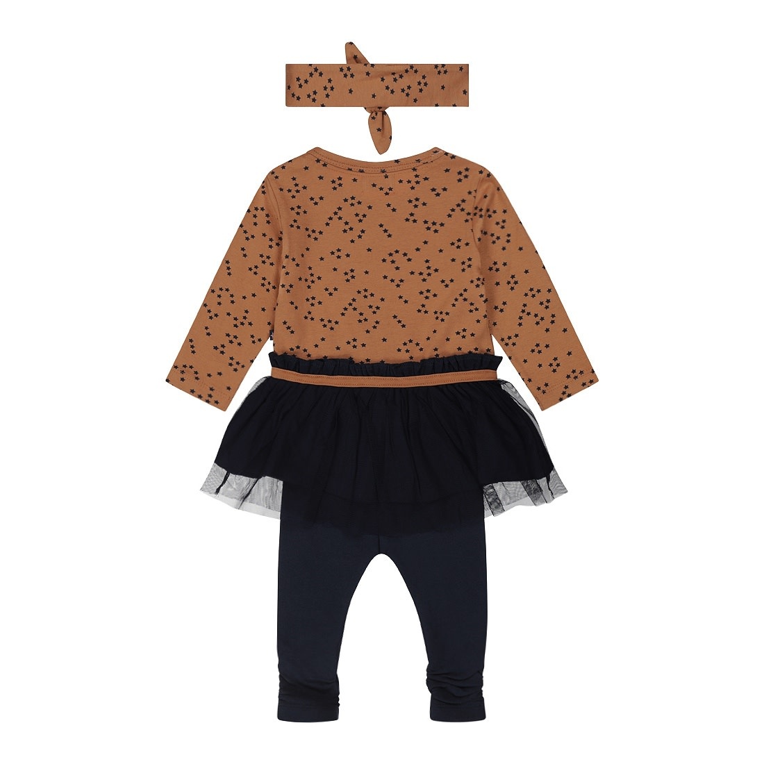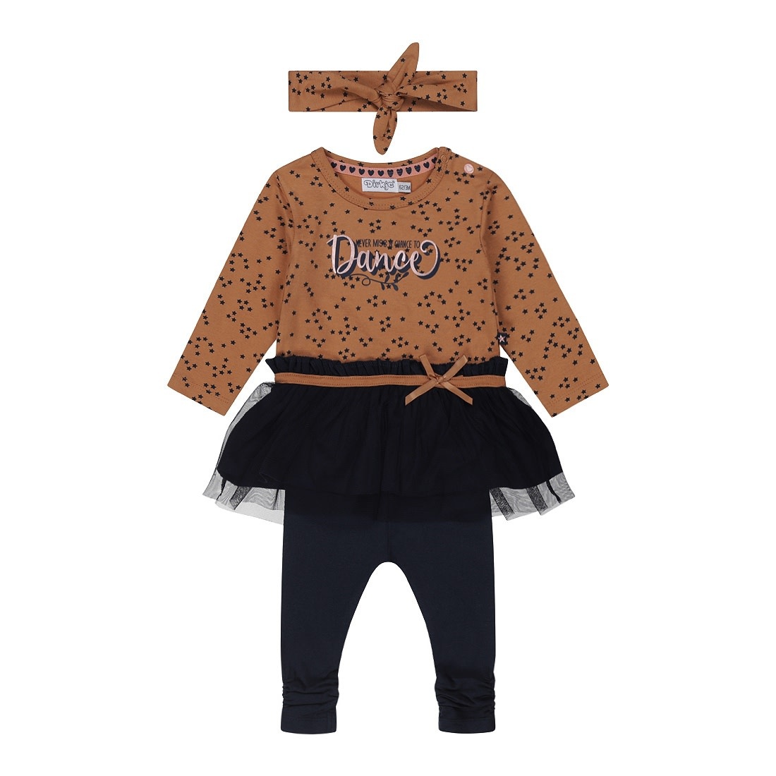 Dirkje 2-delig Pakje LM + Haarband S48340-31. Dit 2-delige pakje bestaat uit een legging en een jurk. Daarnaast zit er ook een haarbandje bij in dezelfde stof als de jurk. De donkerblauwe legging heeft een rimpel detail bij de pijpjes en een elastische band. Het jurkje heeft lange mouwen en een ronde hals met een drukknoopsluiting op de schouder. Het bovenstuk van de jurk is van een camelkleurige stof met blauwe sterren er op. Midden op het voorpand staat de tekst: 'Never miss a chance to dance' in blauw en roze letters. Het rokje is blauw en loopt uit en heeft een laag tule over de stof. De set bestaat 95% uit katoen en 5% uit elastomeer.