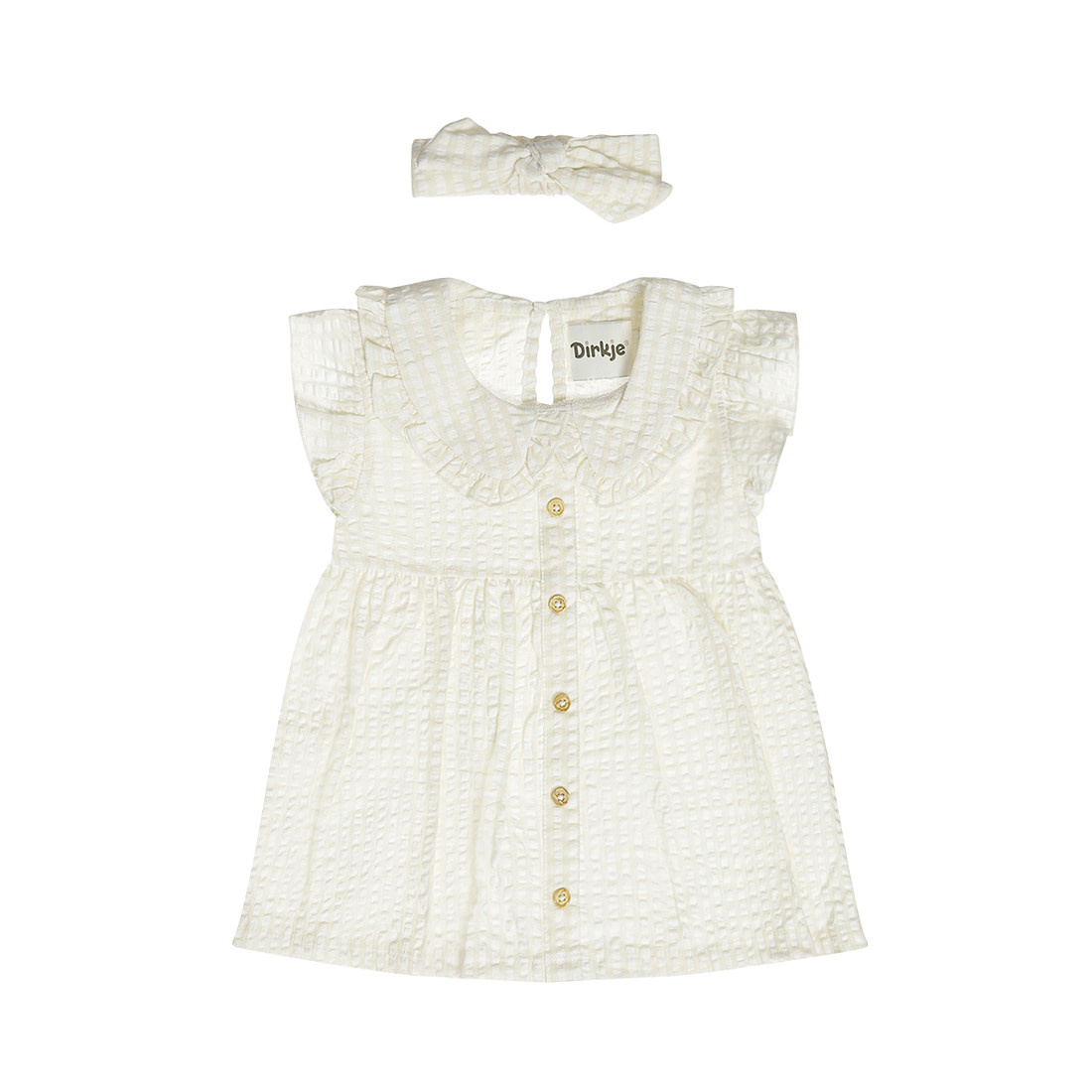Dit jurkje van een leuk seersucker stofje heeft korte mouwen en een ronde hals, daarlangs zit een leuk kraagje met een ruches randje. Middenvoor heeft het jurkje sierknoopjes, op het achterpand zit een knoopsluiting. Bij het jurkje zit een passend haarbandje.