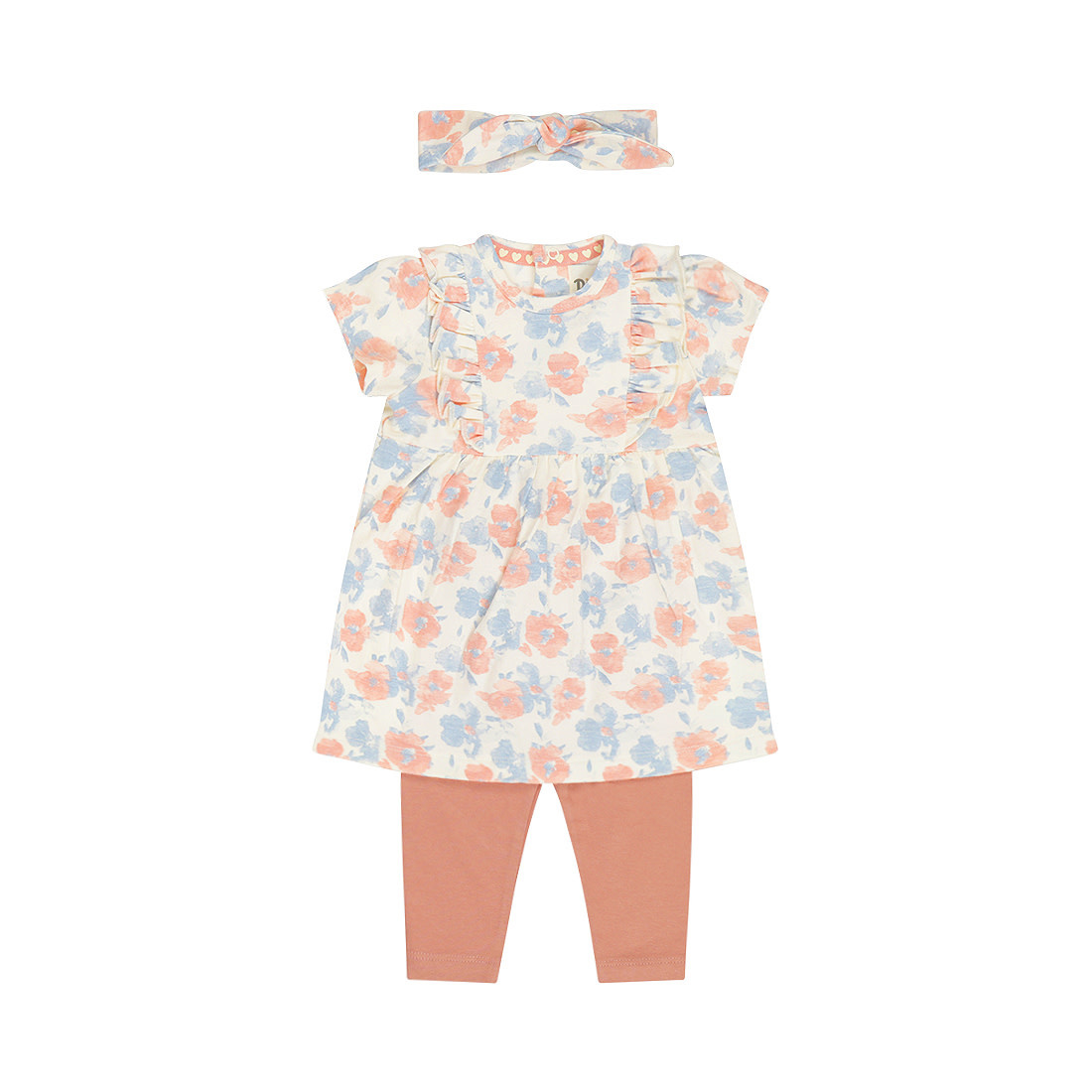 Dit jurkje met korte mouwen heeft een leuk printje van bloemetjes in vrolijke kleuren, op het achterpand zit een drukknoopsluiting. Bij het jurkje zit een passende legging met een elastische boord. Ook zit er een leuk...