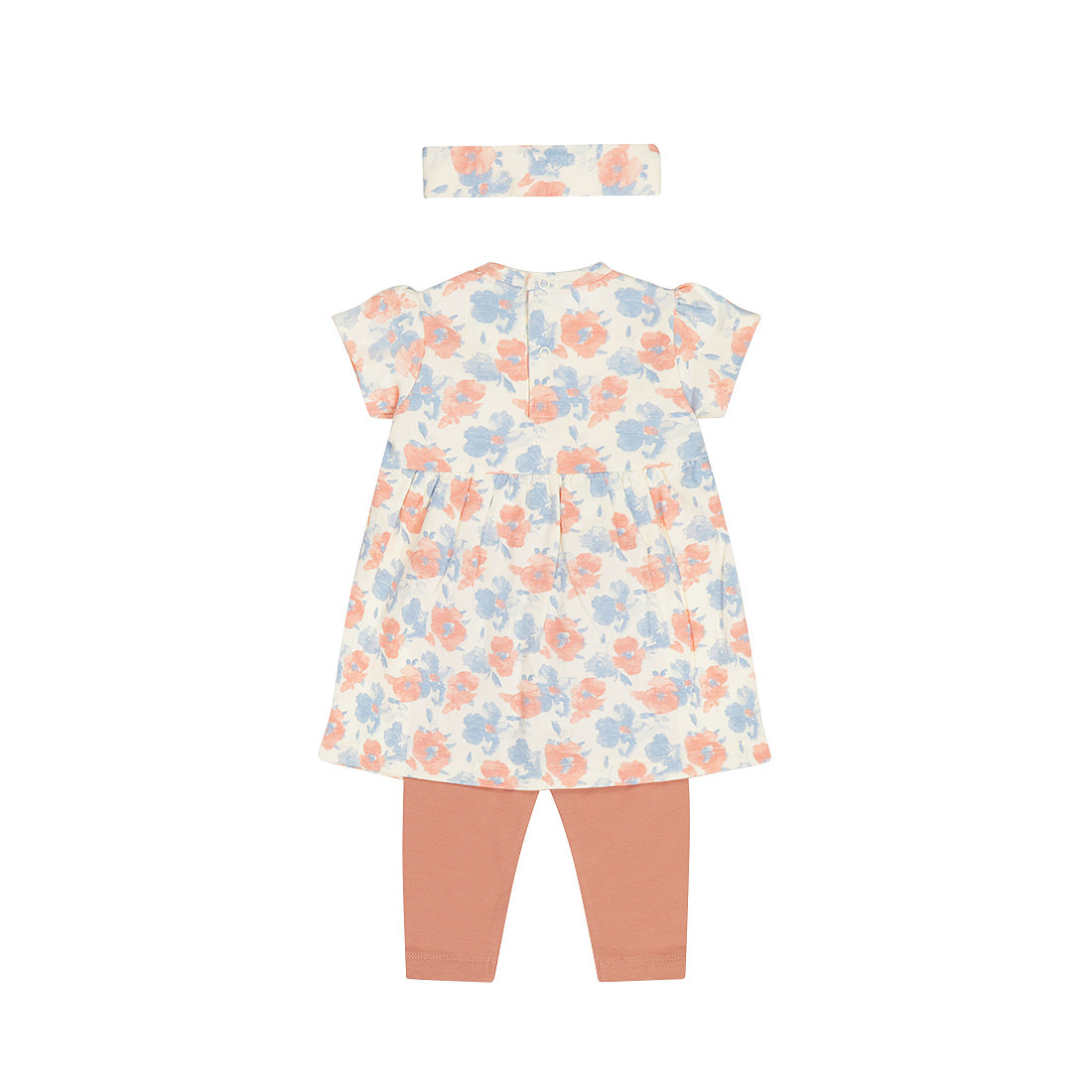 Dit jurkje met korte mouwen heeft een leuk printje van bloemetjes in vrolijke kleuren, op het achterpand zit een drukknoopsluiting. Bij het jurkje zit een passende legging met een elastische boord. Ook zit er een leuk haarbandje bij dit setje met het printje van de jurk.