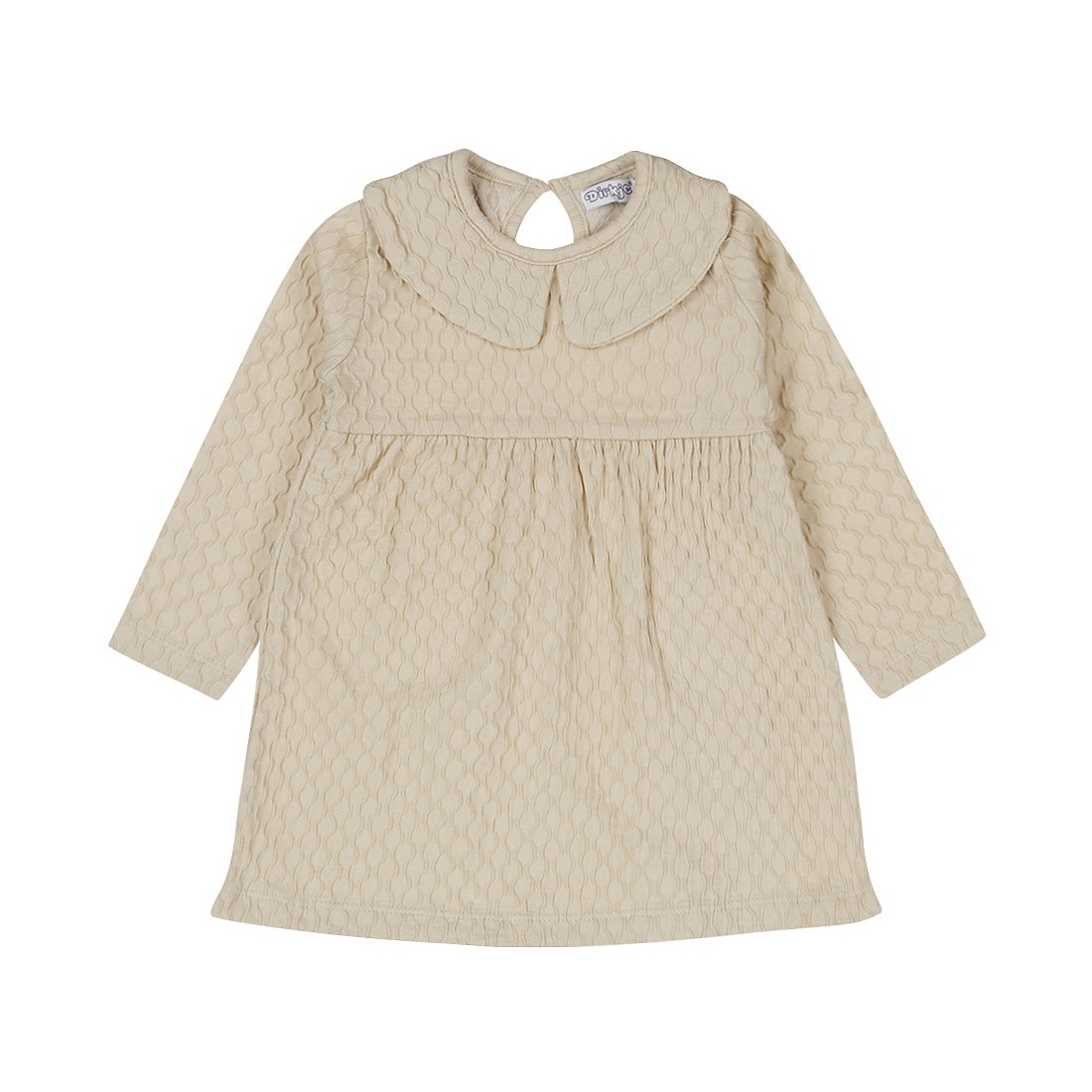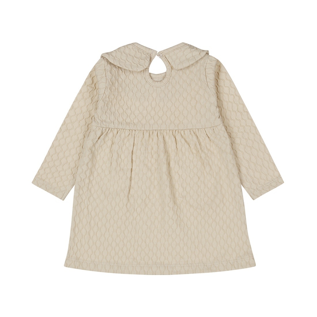 Dit leuke jurkje met een structuurtje van rondjes in de stof heeft een lange mouw en een ronde hals, langs de hals zit een rond kraagje. Op het achterpand zit een knoopsluiting.