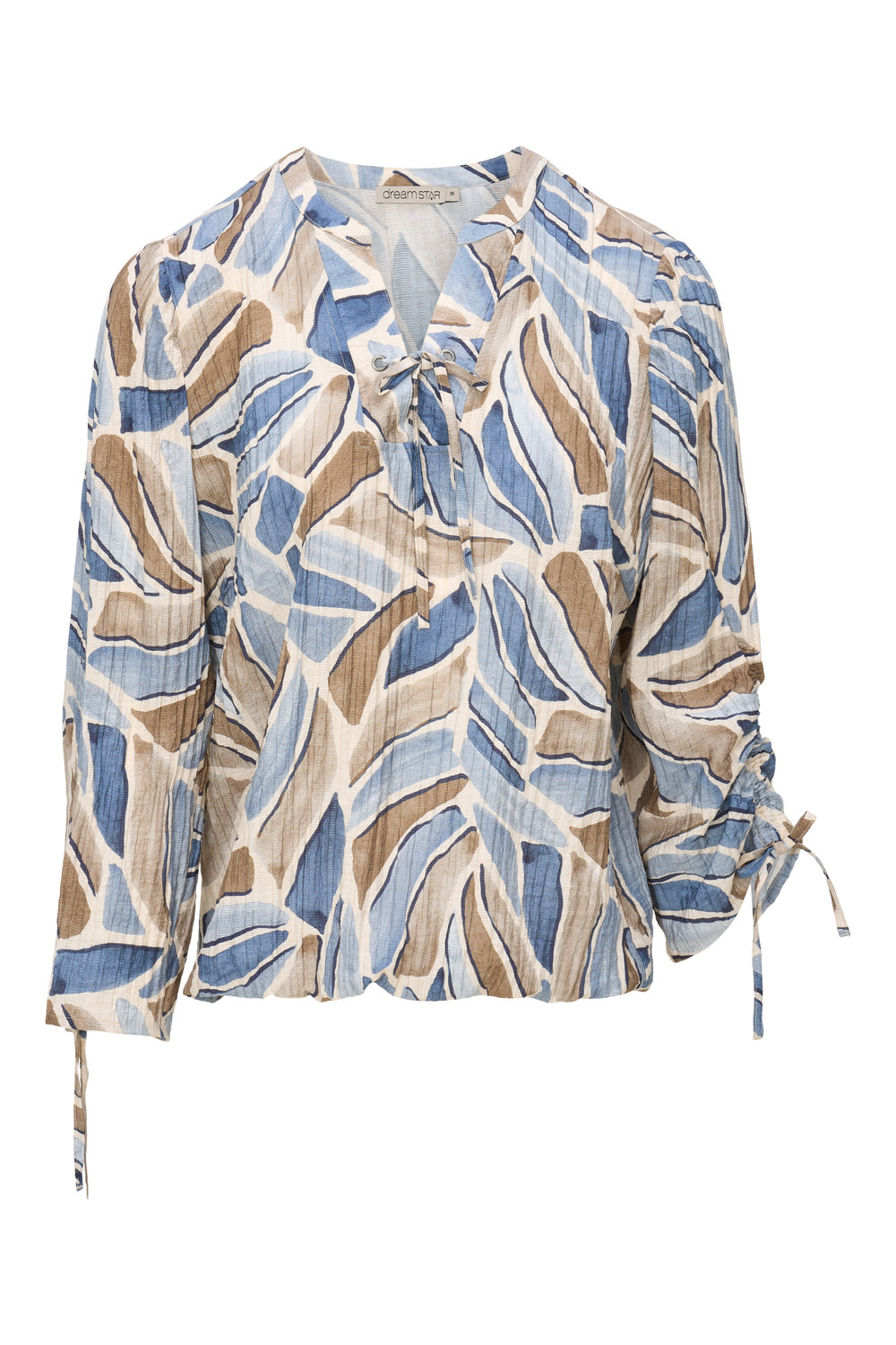 Deze mooie blouson heeft een alloverprint in mooie kleuren, in de stof zit een structuurtje. De blouse heeft een V-hals met daar een leuk strikje. De blouson heeft een driekwart mouw, deze is te verstellen door een koordje, de boord is elastisch.