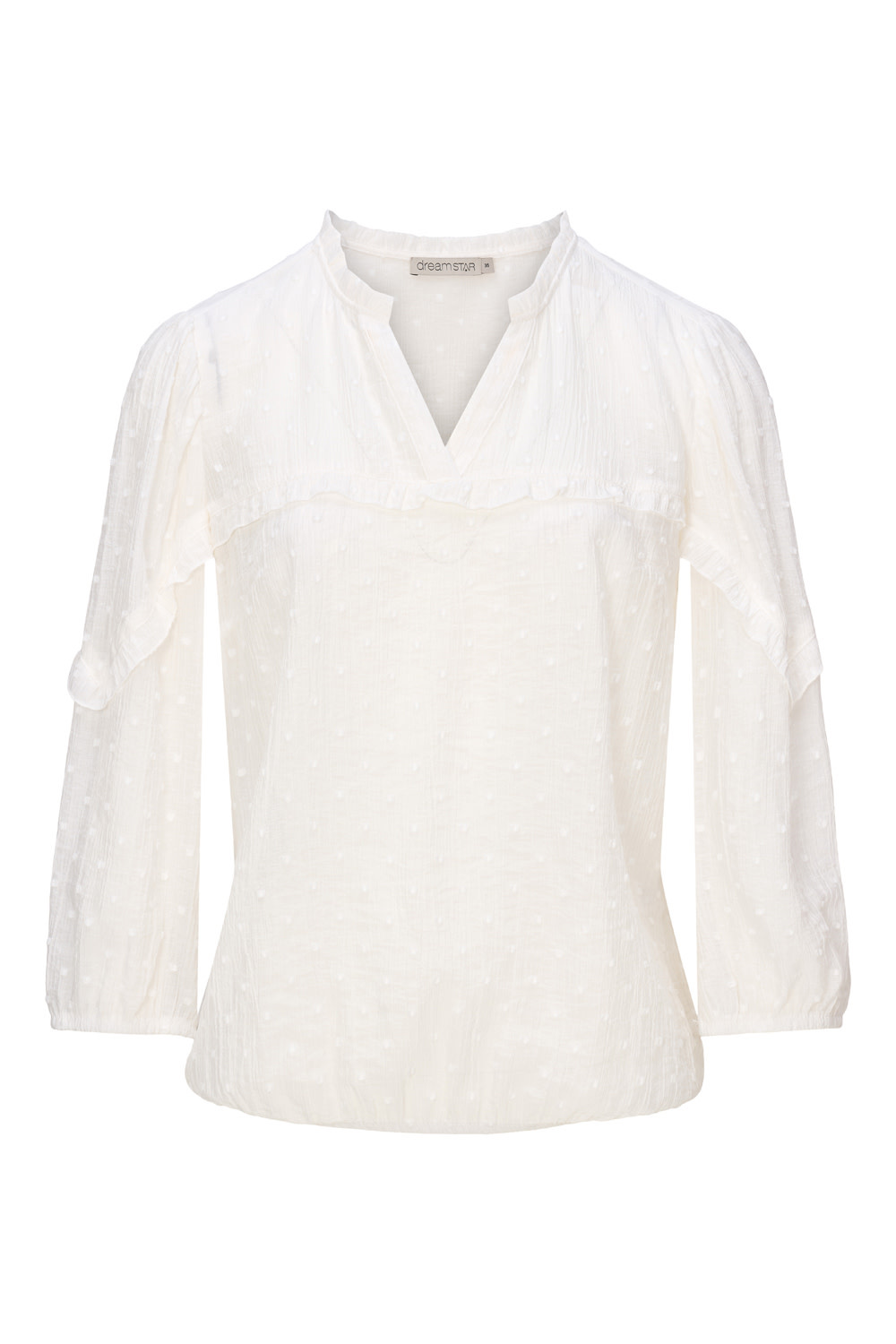 Deze blouson met een V-halsje heeft een driekwart mouw, aan het uiteinde zit een elastisch boordje. De blouson heeft een structuurtje van kleine stipjes in de stof. Op de mouw en het voorpand zit een leuke ruche, deze zit ook langs de hals.