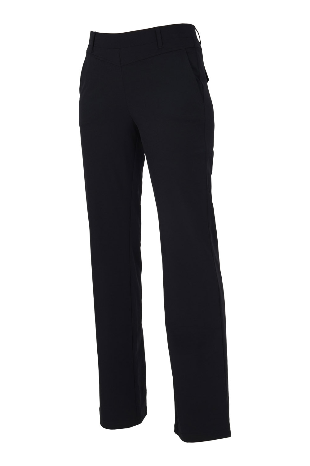 Deze mooie broek van een travelstof heeft een elastische boord en een recht lopende broekspijp. Op het voorpand heeft de broek steekzakjes, op het achterpand zitten sier klepzakken met een knoopsluiting. Verkrijgbaar in de kleuren: Burgundy en zwart.