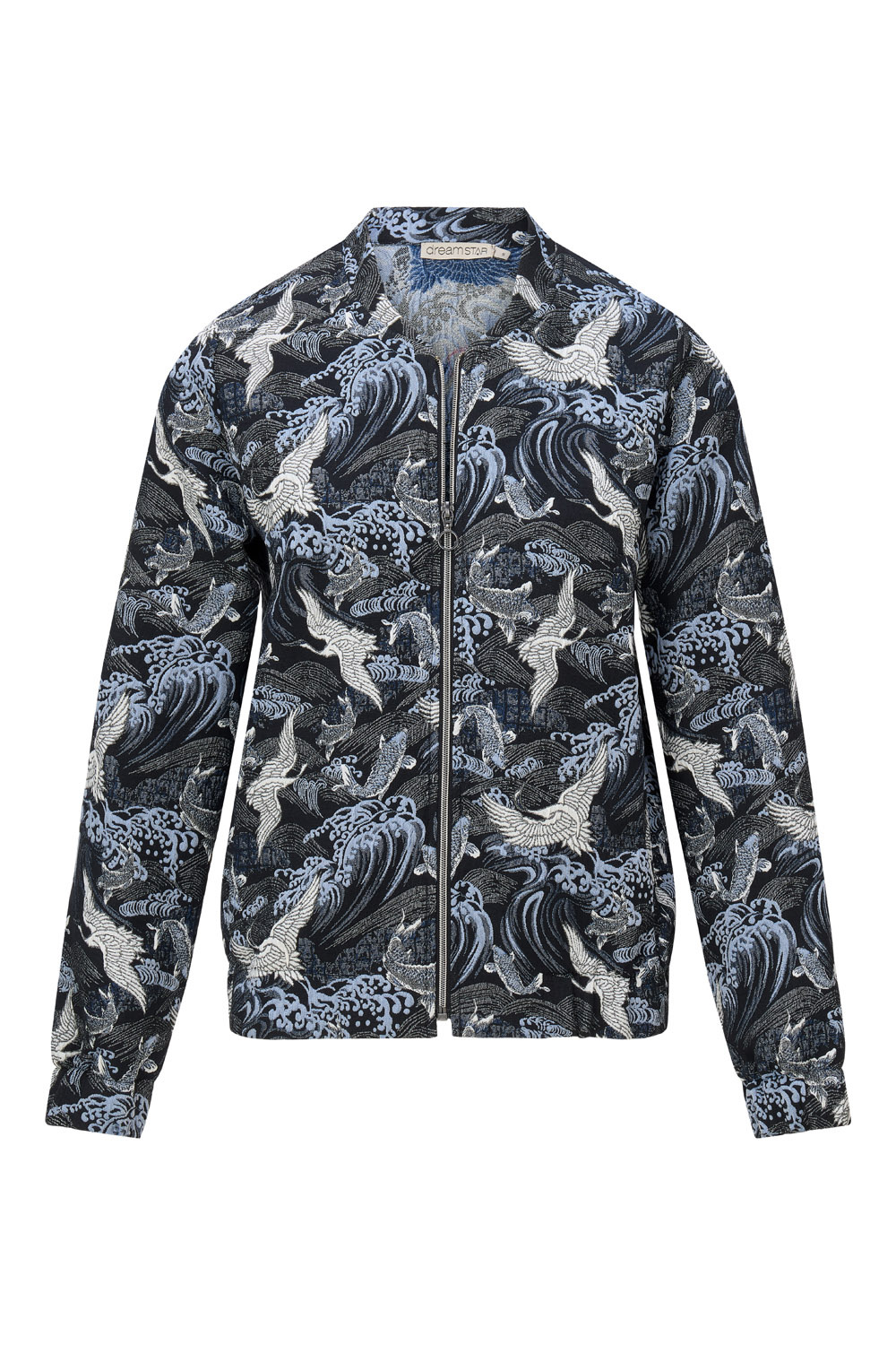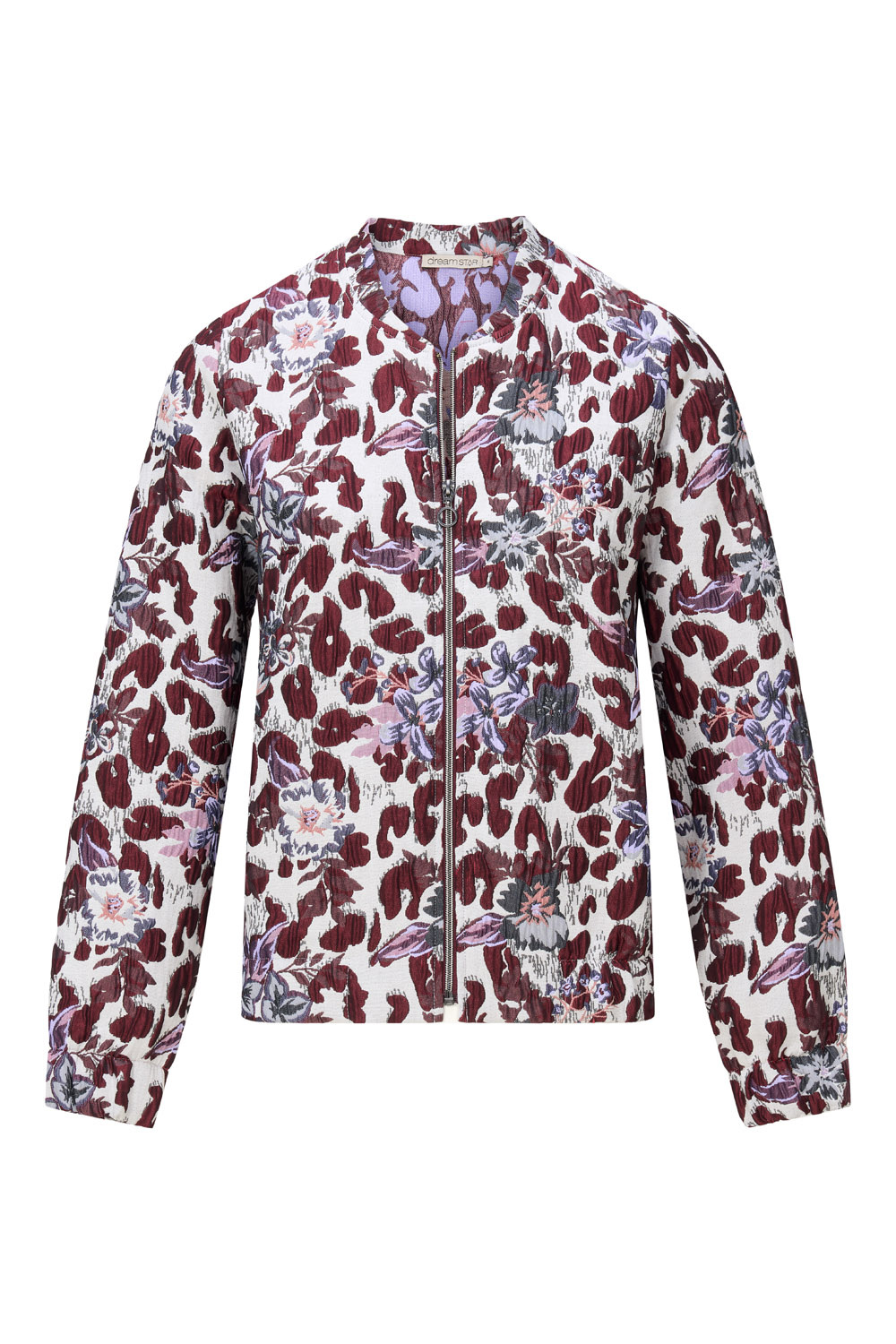 Dit jasje met ritssluiting heeft een mooie brokaat stof, deze is in twee kleuren en prints verkrijgbaar, namelijk: Indigo en Burgundy. Het jasje heeft een klein kraagje en een lange mouw met een elastische boord. Ook de onderkant van het jasje is elastisch waardoor hij mooi aansluit.