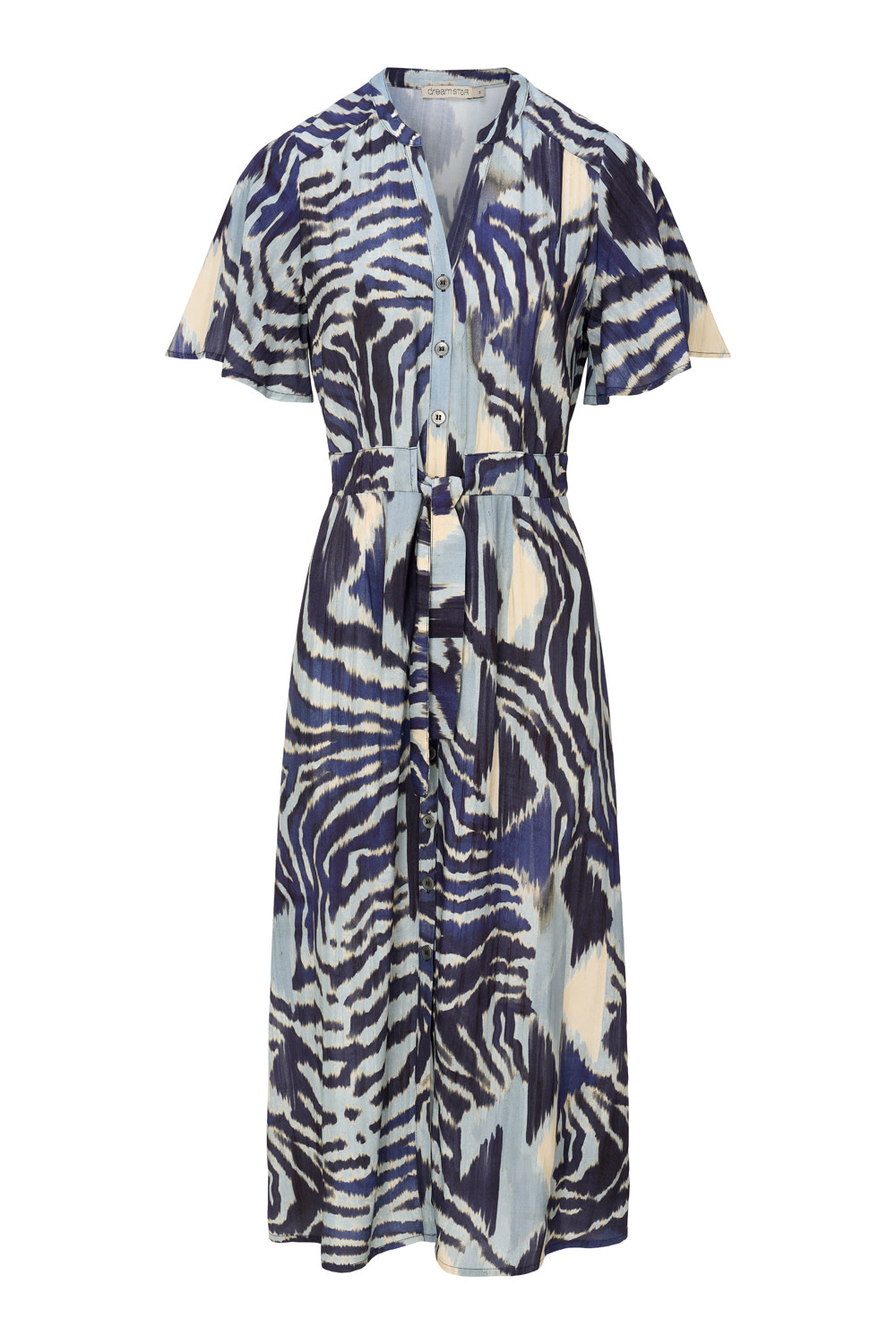 Deze mooie doorknoopjurk heeft een mooie print in blauwe kleuren. De jurk heeft een V-hals en een kort uitlopend mouwtje. In de middel zit een bijpassende ceintuur. De jurk is verkrijgbaar in het donkerblauw en roze.