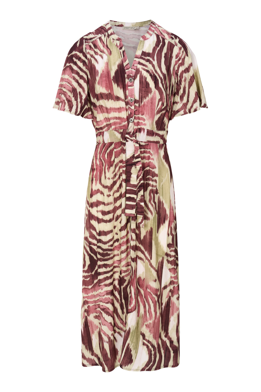 Deze mooie doorknoopjurk heeft een alloverprint in mooie kleuren. De jurk heeft een V-hals en een kort uitlopend mouwtje. In de middel zit een bijpassende ceintuur. De jurk is verkrijgbaar in het donkerblauw en roze.