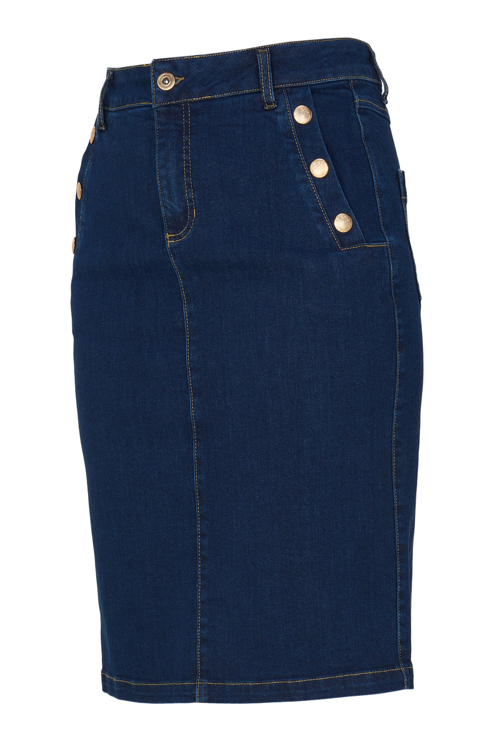 Deze Denim rok heeft een knoopsluiting middenvoor. In het achterpand zit een splitje, ook zitten hier zakjes.