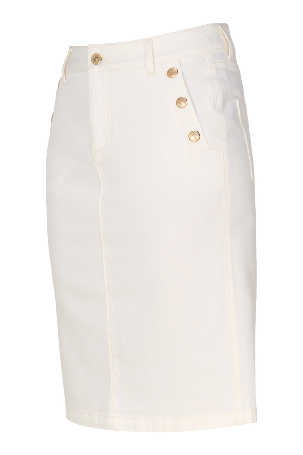 Op het voorpand zitten steekzakjes, deze zijn afgewerkt met leuke gouden knoopjes. De rok heeft lussen voor een ceintuur. De rok is beschikbaar in de kleur Denim en Ivoor.