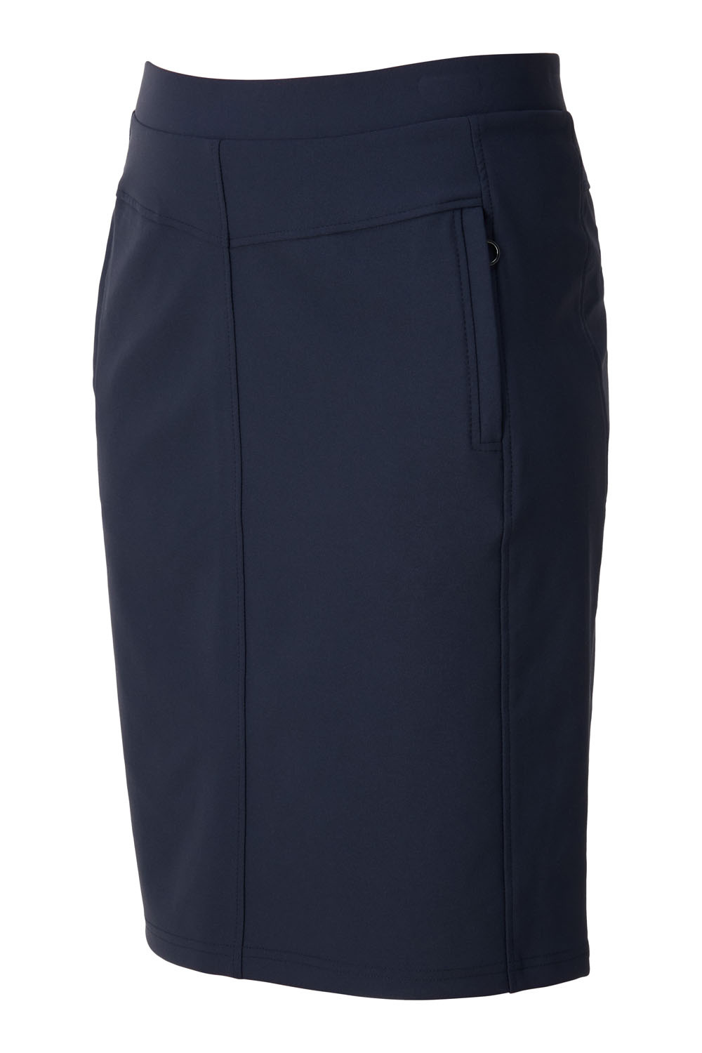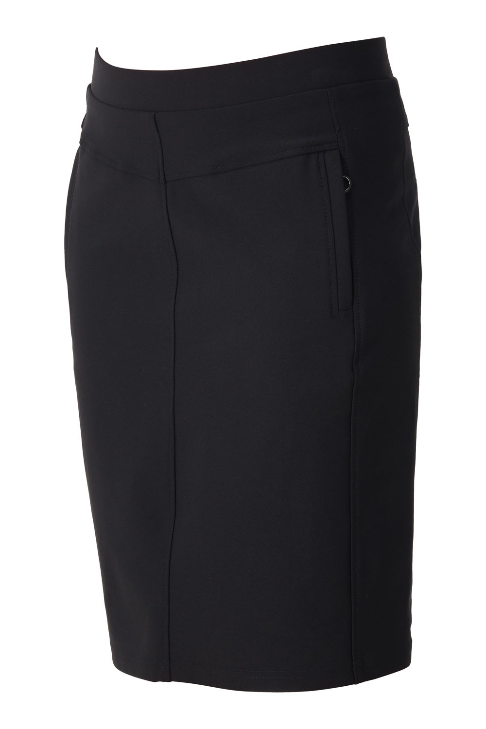 Deze rok van travelstof heeft een elastische boord. Op het voorpand zitten twee zakken met een ritsje. Op het achterpand heeft de rok twee neppe zakjes.