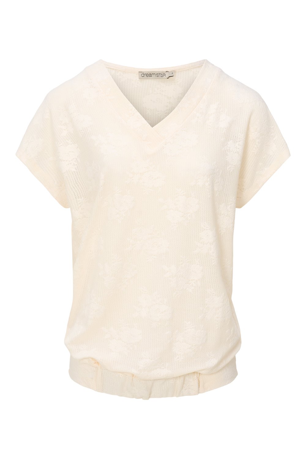 Dreamstar Shirt Z26 217 Courtney. Dit shirt met V-Hals heeft korte aangeknipte mouwtjes. Het shirt heeft aan de voorkant in de zoom een stukje elastiek wat een bloezend effect geeft. De stof is een ausbrenner met ingeweven bloemen. Gemaakt van 98% polyester en 2% elastomeer.