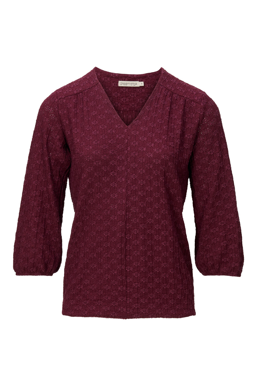 Deze mooie Broderie top is verkrijgbaar in de kleuren Burgundy en Ivoor. De top heeft een V-hals en een driekwart mouw met aan het uiteinde een elastiek wat een bloezend effect geeft. Ook de boord van de top is elastisch.
