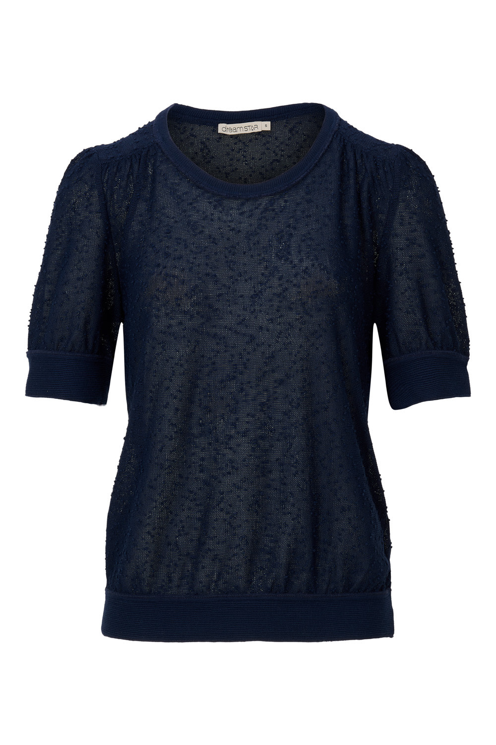 Deze top heeft een ronde hals en een korte mouw, de mouwboord en boord zijn van een andere stof dan de rest van de top. De top heeft een allover bolletjes structuur in de stof, hij is licht doorschijnend.