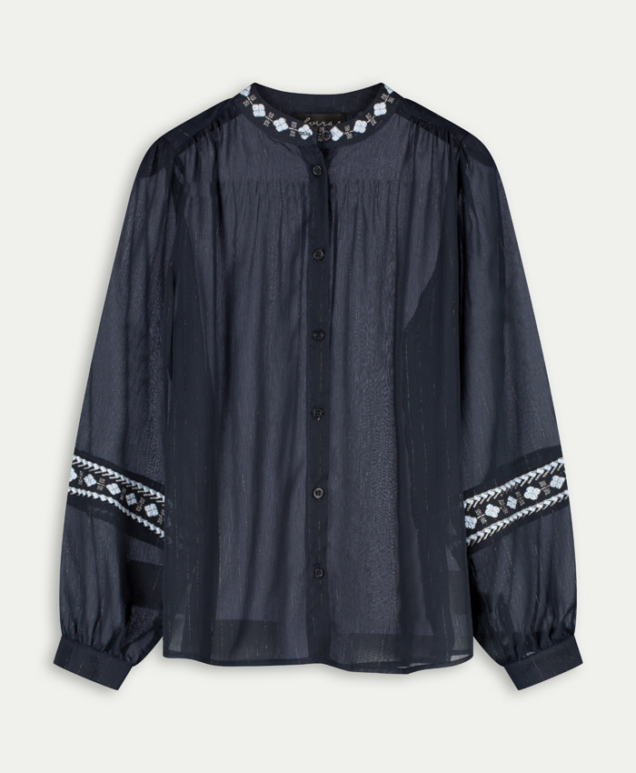 Deze leuke blouse met lange mouwen heeft een knoopsluiting middenvoor. De blouse is van een dunne en doorschijnende stof, in de stof zit een donkerblauw glitterdraadje. Op de mouw en langs de hals zit een leuk geborduurd randje.