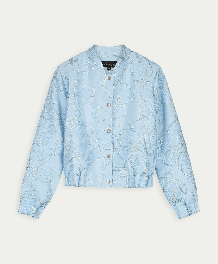 Dit leuke bomber jasje met een klein opstaand kraagje heeft een mooie brokaat stof. Middenvoor zit een knoopsluiting. Het jasje heeft elastische boorden waardoor het mooi aansluit.