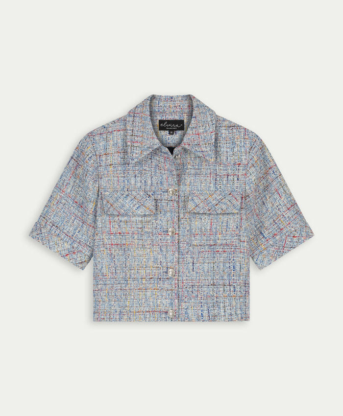 Dit jasje van een kleurrijke boucle stof heeft een korte mouw. Op het voorpand zitten klepzakjes, middenvoor zit een knoopsluiting van zilveren knopen. Het jasje heeft een opstaande kraag.