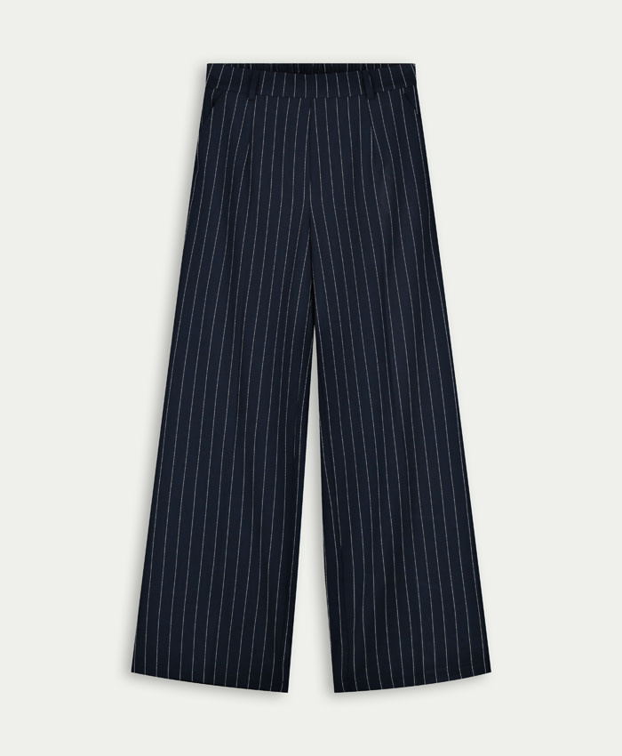 Deze mooie pantalon met een elastische boord heeft een krijt streepje in de stof. De pantalon heeft steekzakjes in het voorpand. De broekspijpen lopen wijd uit. De pantalon is leuk te combineren met de bijpassende blazer.