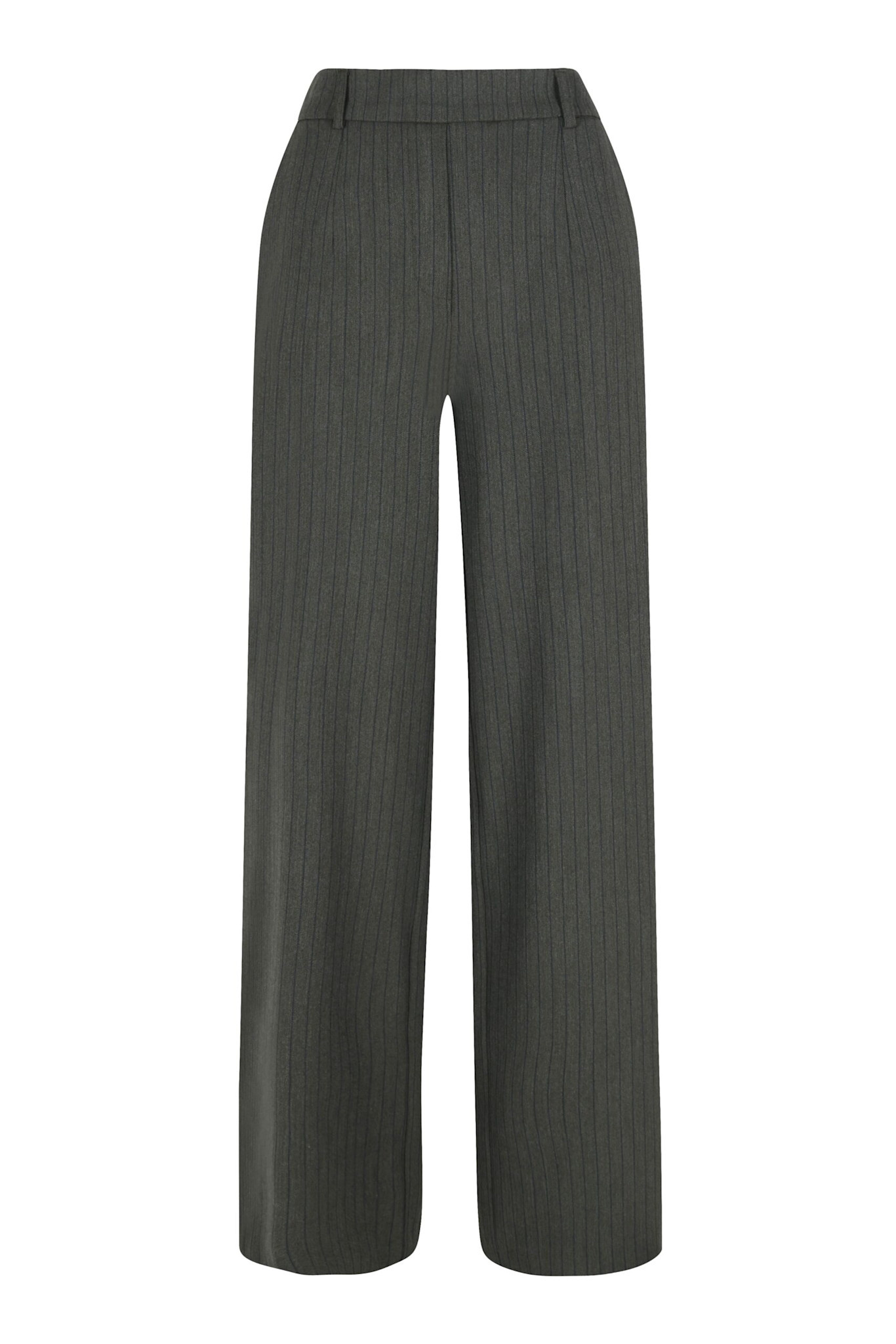Deze mooie pantalon met een elastische boord heeft een klein streepje in de stof. De pantalon heeft een recht lopende broekspijp. Op de boord zitten lussen voor een ceintuur.