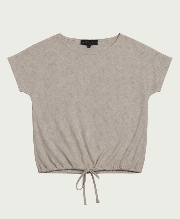 Dit leuke shirtje met een gouden glittertje heeft een ronde hals en een korte mouw. In de stof zit een zigzag structuurtje. Het shirtje heeft een elastische boord met een aantrekkoordje.
