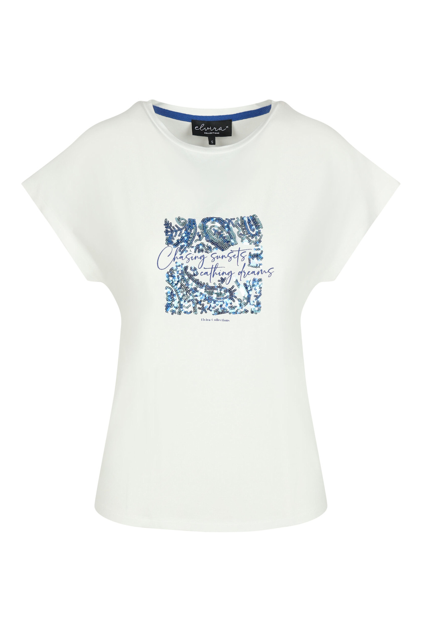 Dit leuke shirt heeft een opdruk van blauwe pailletten en de tekst: Chasing sunsets, cathing dreams.