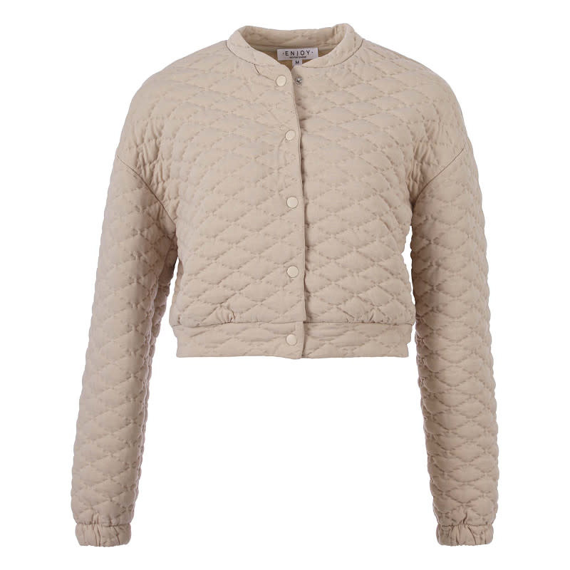 Enjoy Bomberjasje Diamant Jacquard. Dit korte jasje met lange mouwen heeft een drukknoopsluiting. Gemaakt van 97% polyester en 3% elastomeer.