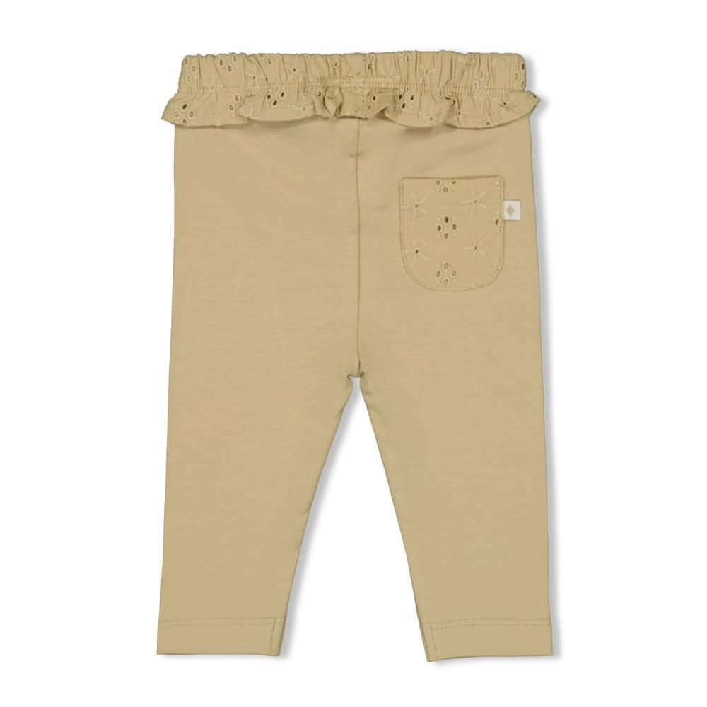 Deze legging heeft een elastische boord. Langs de boord zit een leuk broderie randje, met middenvoor een knoopje. De legging is leuk te combineren met de items van het thema Let Your Dream Blossom.