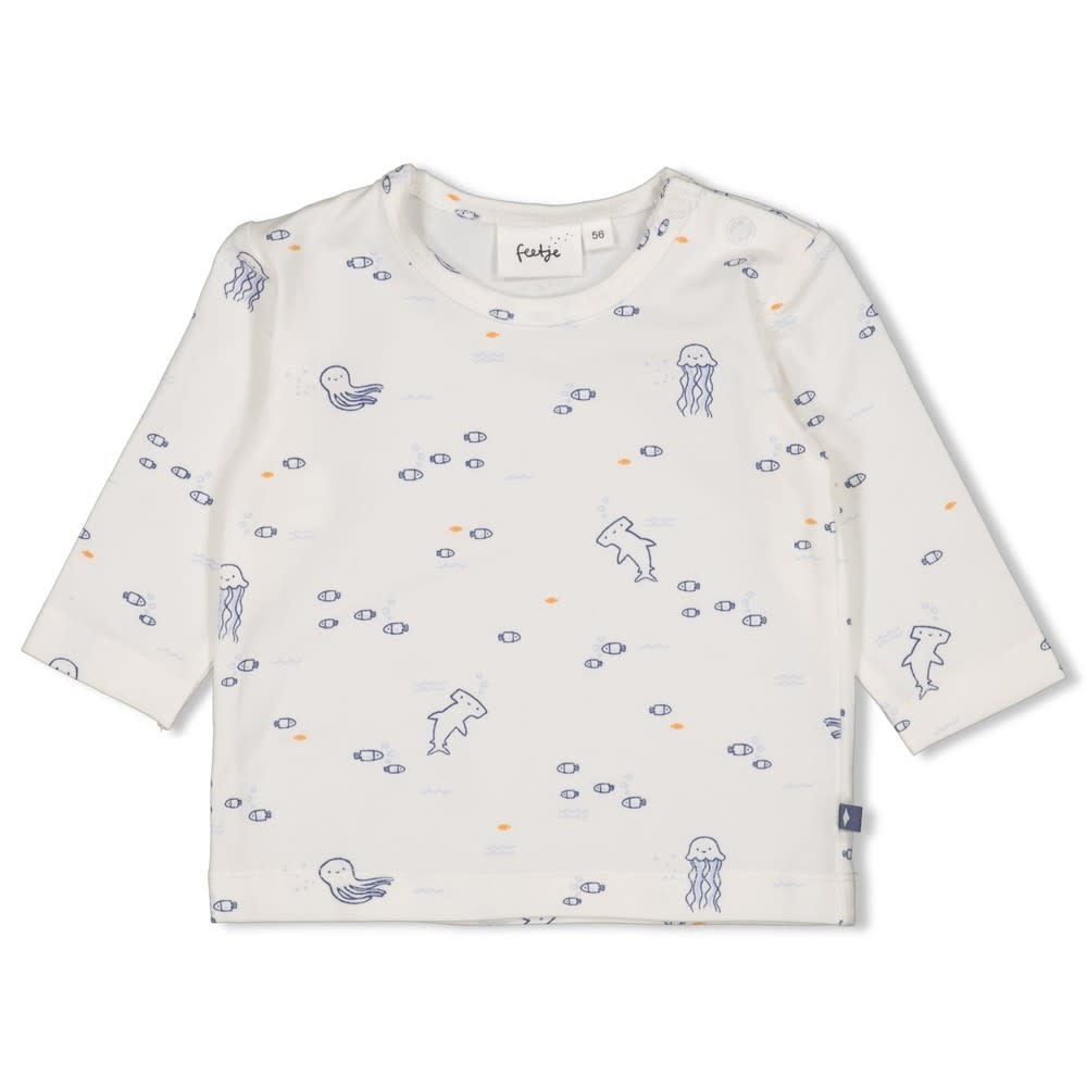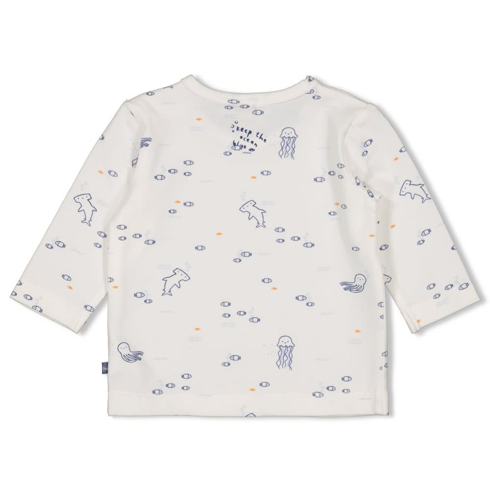 Dit shirtje met lange mouwen heeft een alloverprint van zeediertjes, op de schouder zit een drukknoopsluiting.