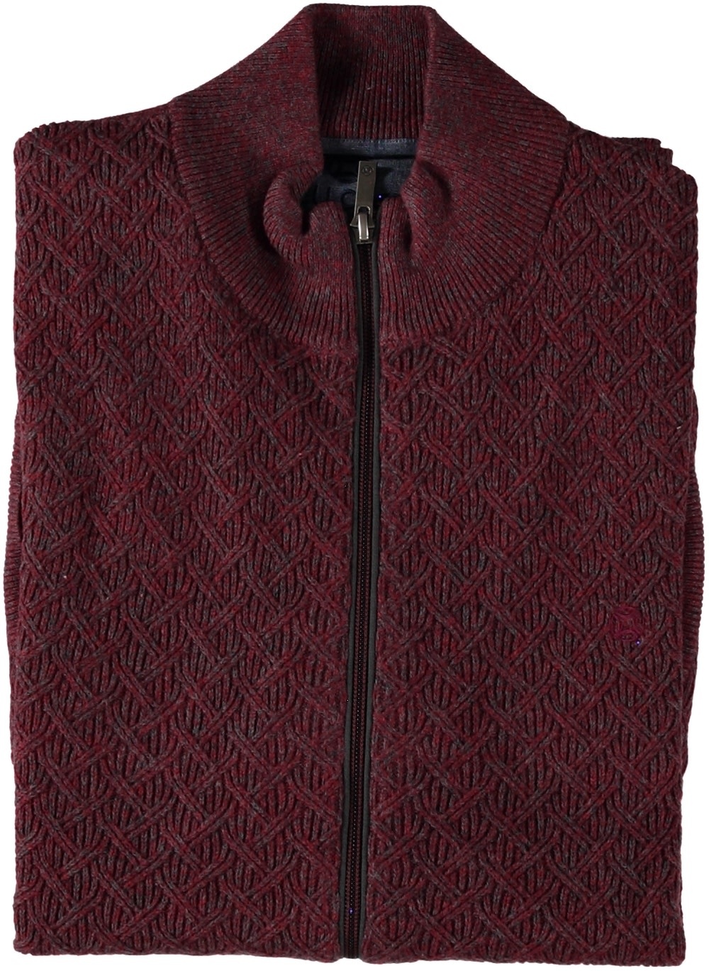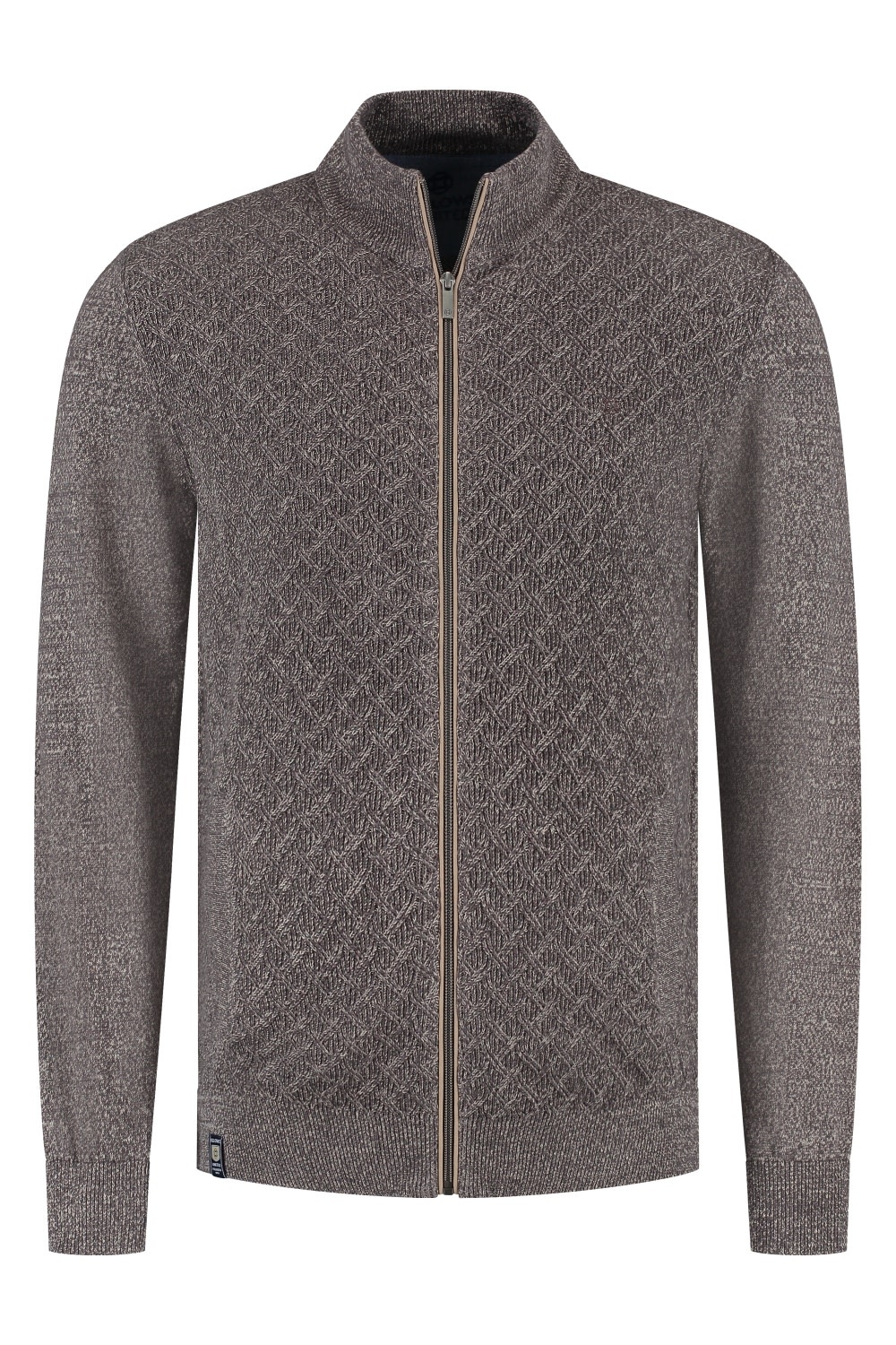 Dit vest met een opstaande kraag heeft op het voorpand een kabelstructuur in de stof. De mouwen en het achterpand hebben een fijn breisel. Middenvoor zit een ritssluiting.
