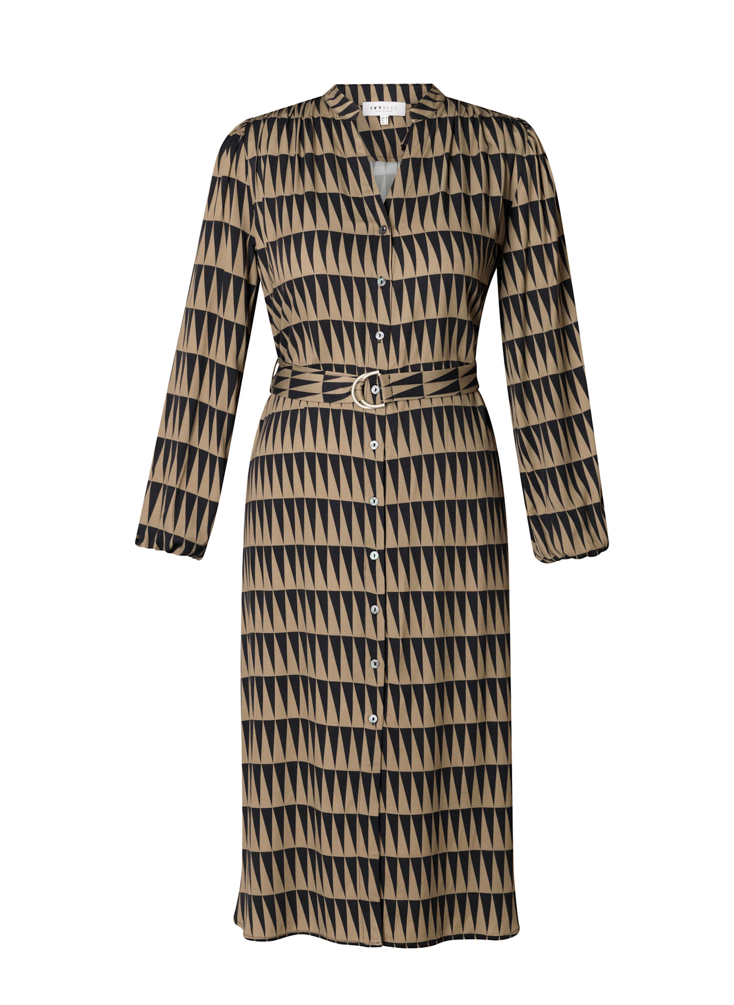 Ivy Beau Jurk Ser. Deze lange jurk met grafische print heeft lange mouwen en een doorknoopsluiting. De jurk heeft een V-Hals en elastiekjes door de boordjes van de mouwen. De zomen zijn rond afgewerkt met splitjes in de zijnaden. Wordt geleverd met bijpassende ceintuur. Gemaakt van 100% viscose.