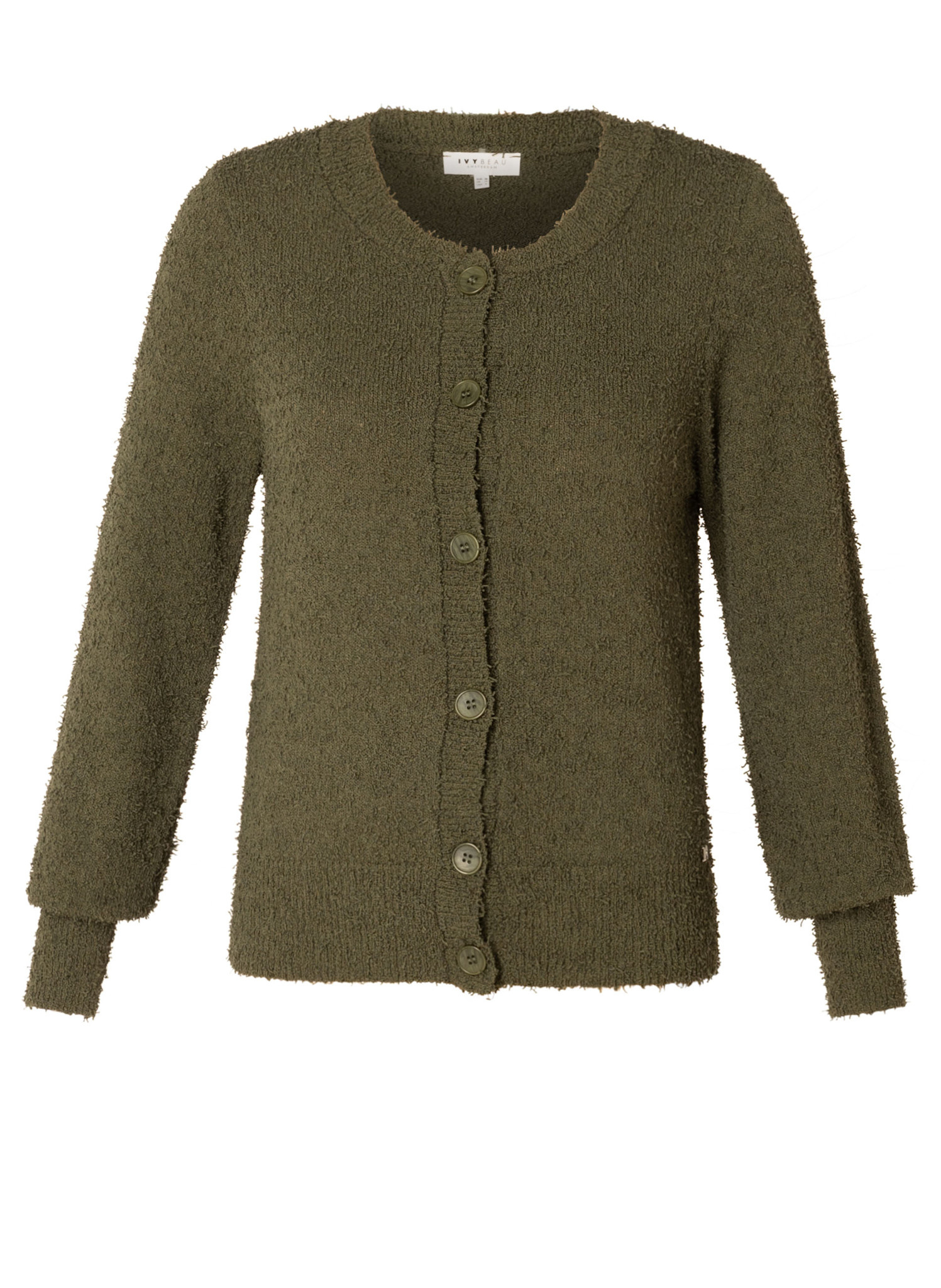 Dit leuke vest met een harig breisel, heeft een lange mouw met een versmalde mouwboord. Middenvoor zit een knoopsluiting.