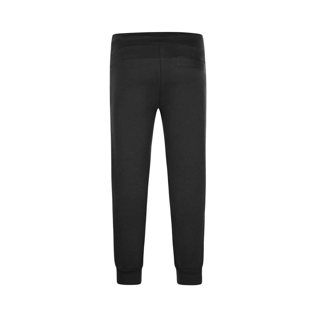 Dit zwarte jogging broekje heeft een elastische boordje met een sierstrikje. Ook aan het uiteinde van de broekspijp zit een elastisch boordje. Op het voorpand zitten twee zakjes, ook op het achterpand zitten twee sierzakken.
