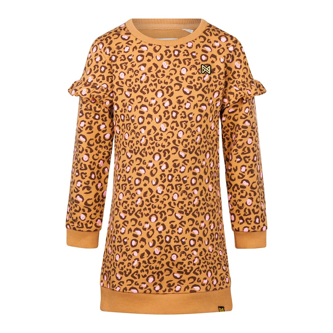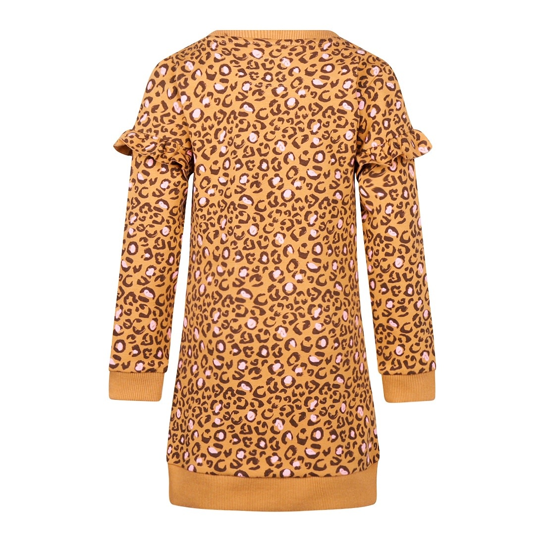 Koko Noko Jurkje LM. Deze jurk heeft lange mouwen en een recht model. De stof van de jurk heeft een camel ondergrond en een roze met bruine luipaardprint. De jurk is afgewerkt langs de hals, de mouwen en de onderkant van de jurk met een boord van ribstof....