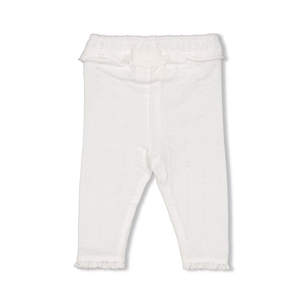 Deze legging van een seersucker stofje hoort bij het thema Blossom. De legging heeft een elastische boord met daarlangs ruches, middenvoor zit een strikje. Aan de onderkant van de legging loopt een klein kantje.