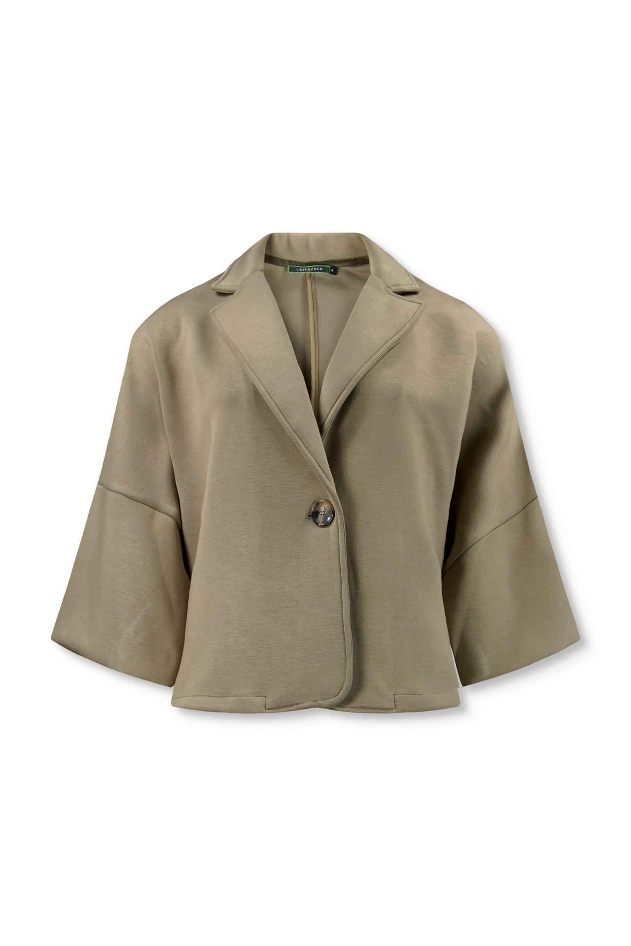 Lizzy & Coco Cape Jasje Amise. Dit mooie cape jasje van zachte sweatstof, heeft een wijde uitlopende mouw, ook op het achterpand loopt het jasje iets uit en zitten er plooitjes bij de mouw. Het jasje heeft een opstaande kraag en een knoopsluiting op het voorpand. Gemaakt van 50% polyester, 46% viscose en 4% elastomeer.