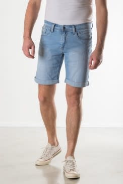 New Star Heren Jacksonville Short. Deze 5-pocket model van stretch denim valt boven de knie en kan korter gedragen worden door de pijpen om te slaan. Gemaakt van 98% katoen en 2% elastomeer.