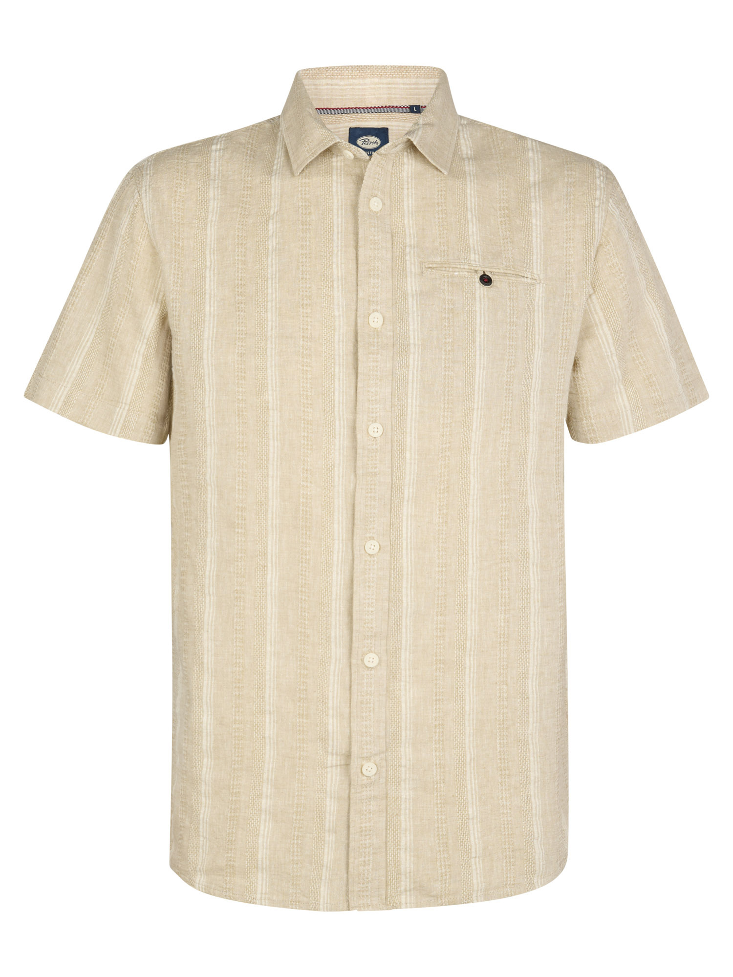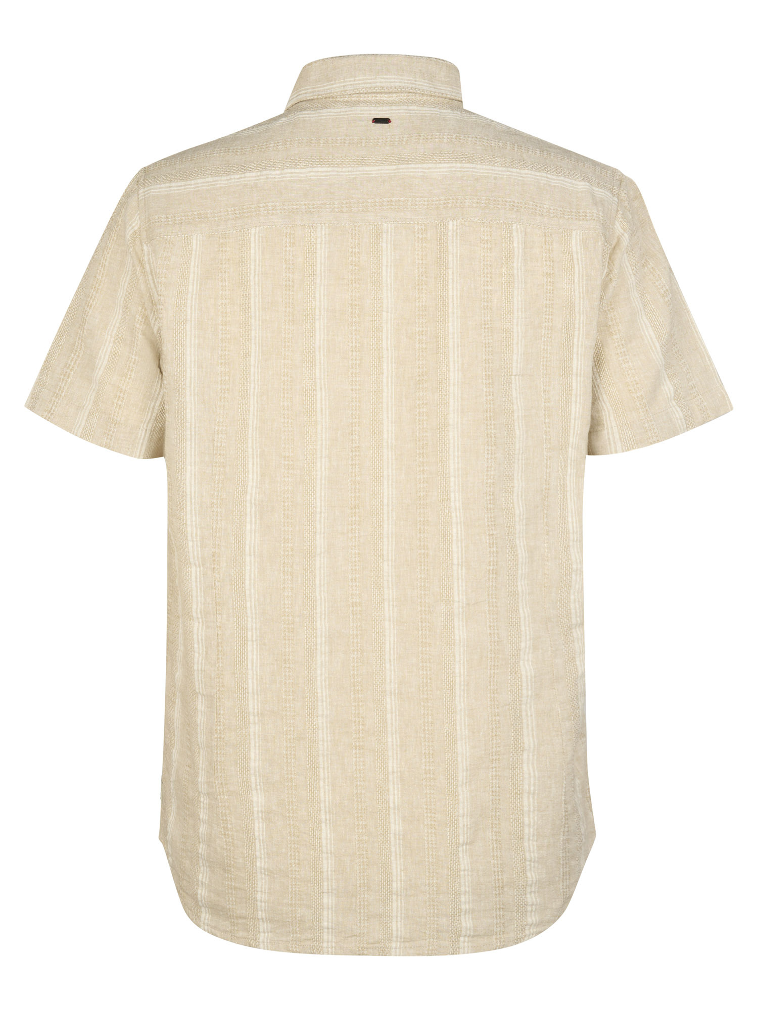 Dit linnen overhemd heeft een streepjes print in de stof, middenvoor zit een knoopsluiting. Op het voorpand zit een borstzakje.