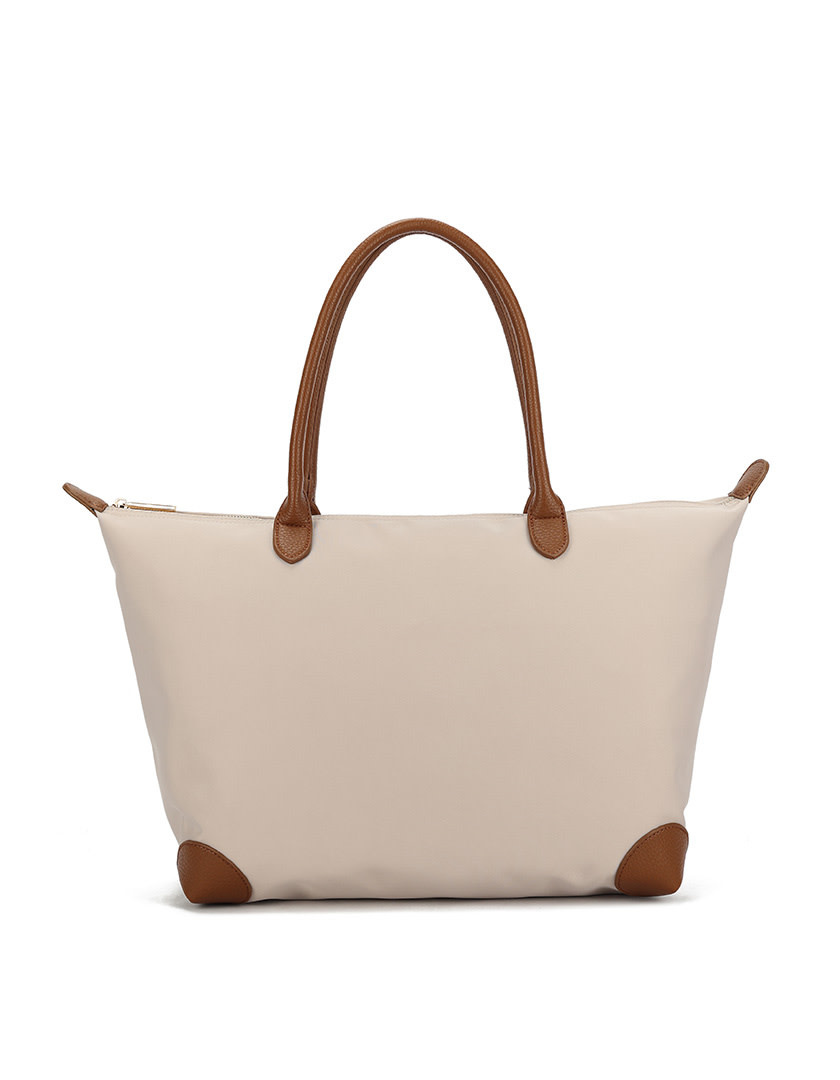 Deze beige shopper van een stoffen materiaal heeft bruin leren details. De afmetingen van de tas zijn 53 cm x 40 cm.