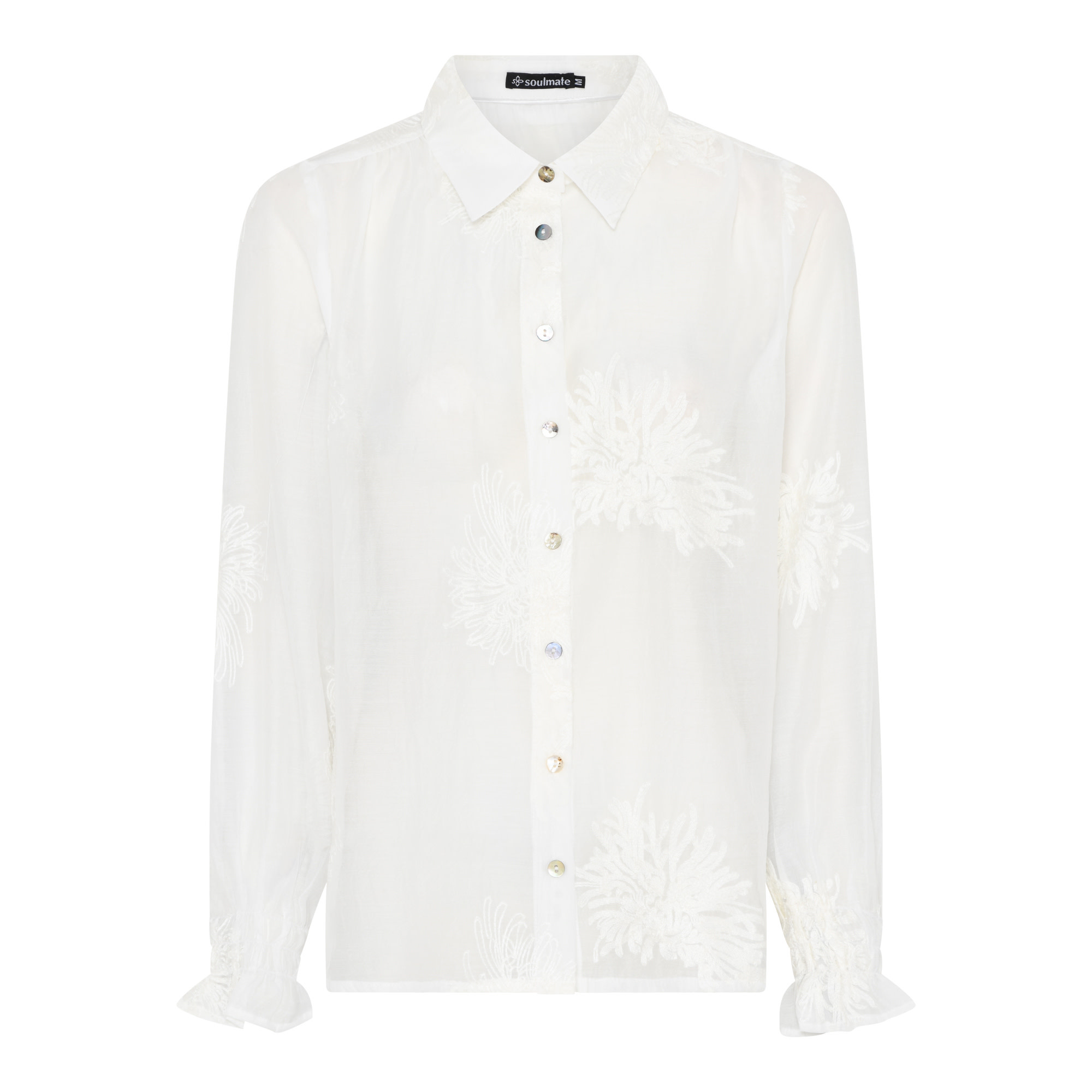 Deze mooie blouse met een opstaande kraag is van een dunne doorschijnende stof, op de stof zitten geborduurde bloemen. De blouse heeft lange mouwen met aan het uiteinde een ruche. Middenvoor heeft de blouse een knoopsluiting van parelmoer knoopjes.